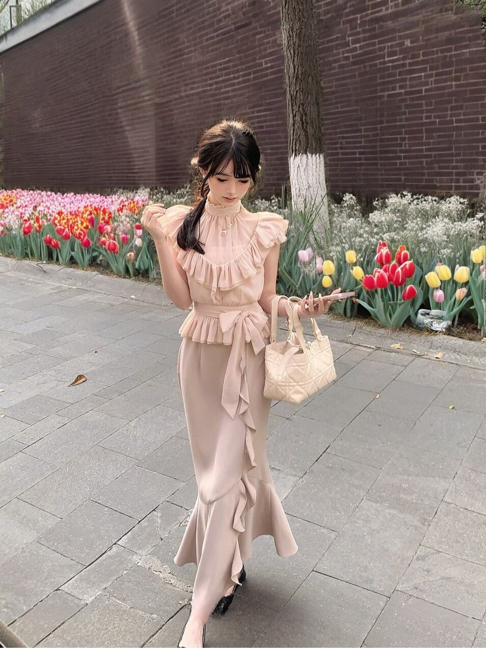程よい上品な透け感と、ウエストマークのリボンベルトと女性らしいメリハリのある美シルエットを演出してくれます。