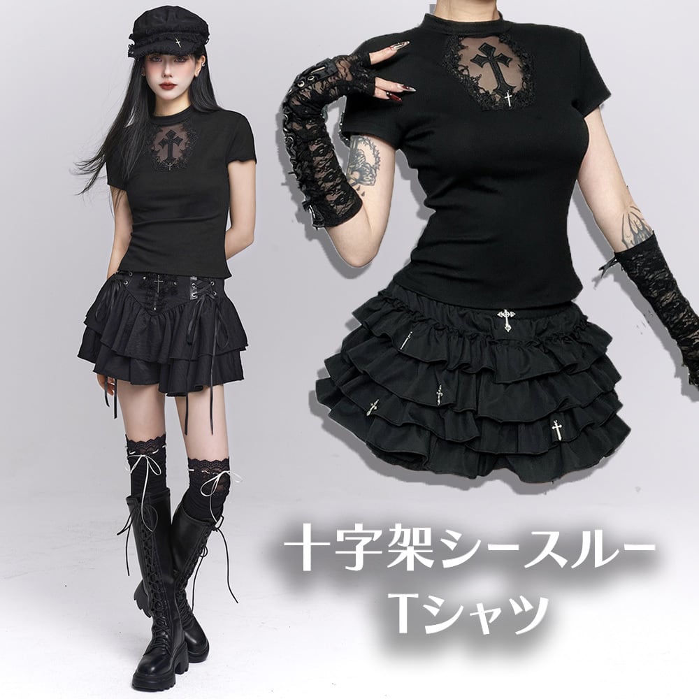 Myurina 十字架シースルーTシャツ サブカル ミニT ピチT y2k 地雷系 ロザリオ クロス シアーシャツ 平成 ゴスロリ 量産型 ミュリナ