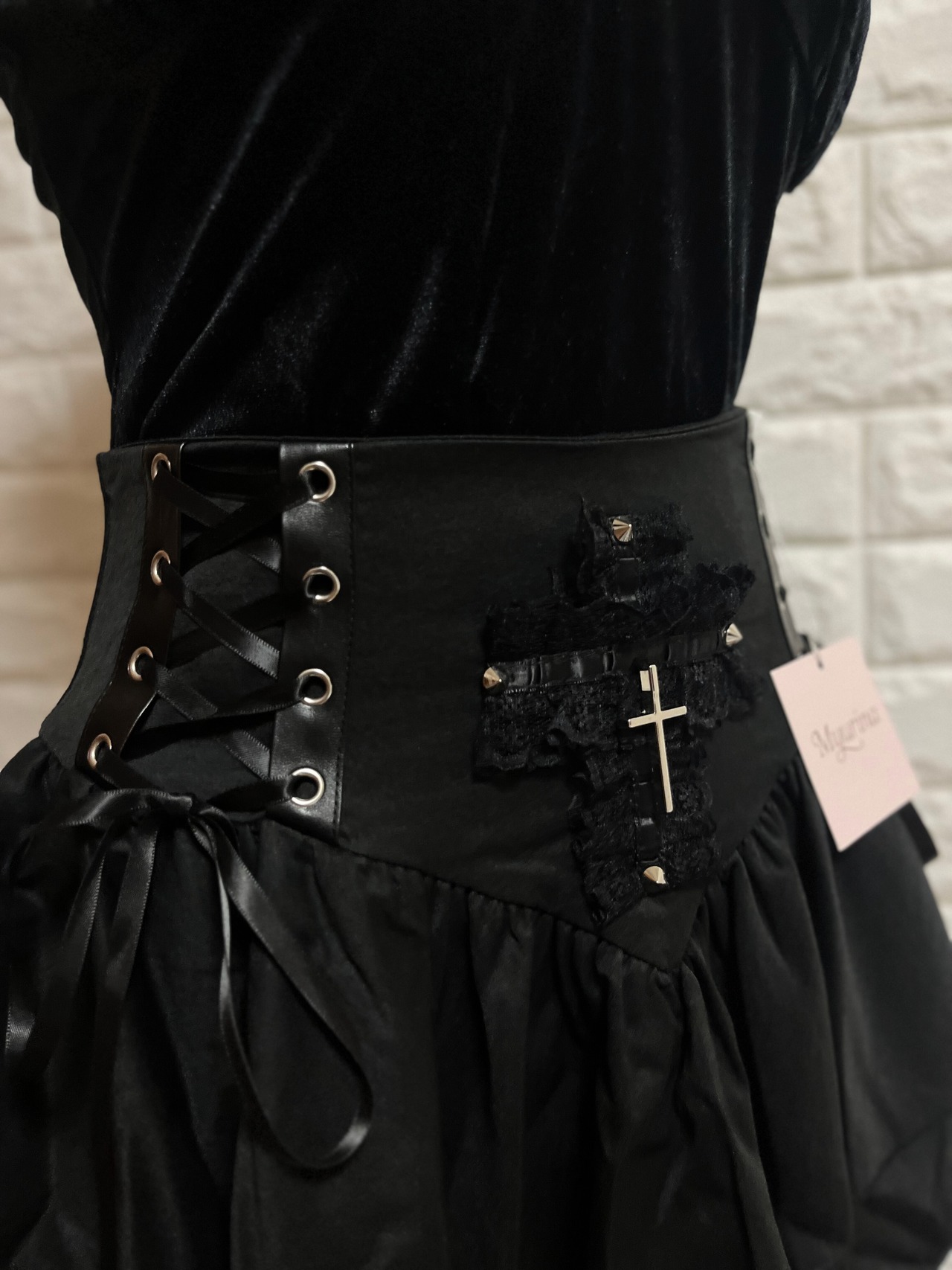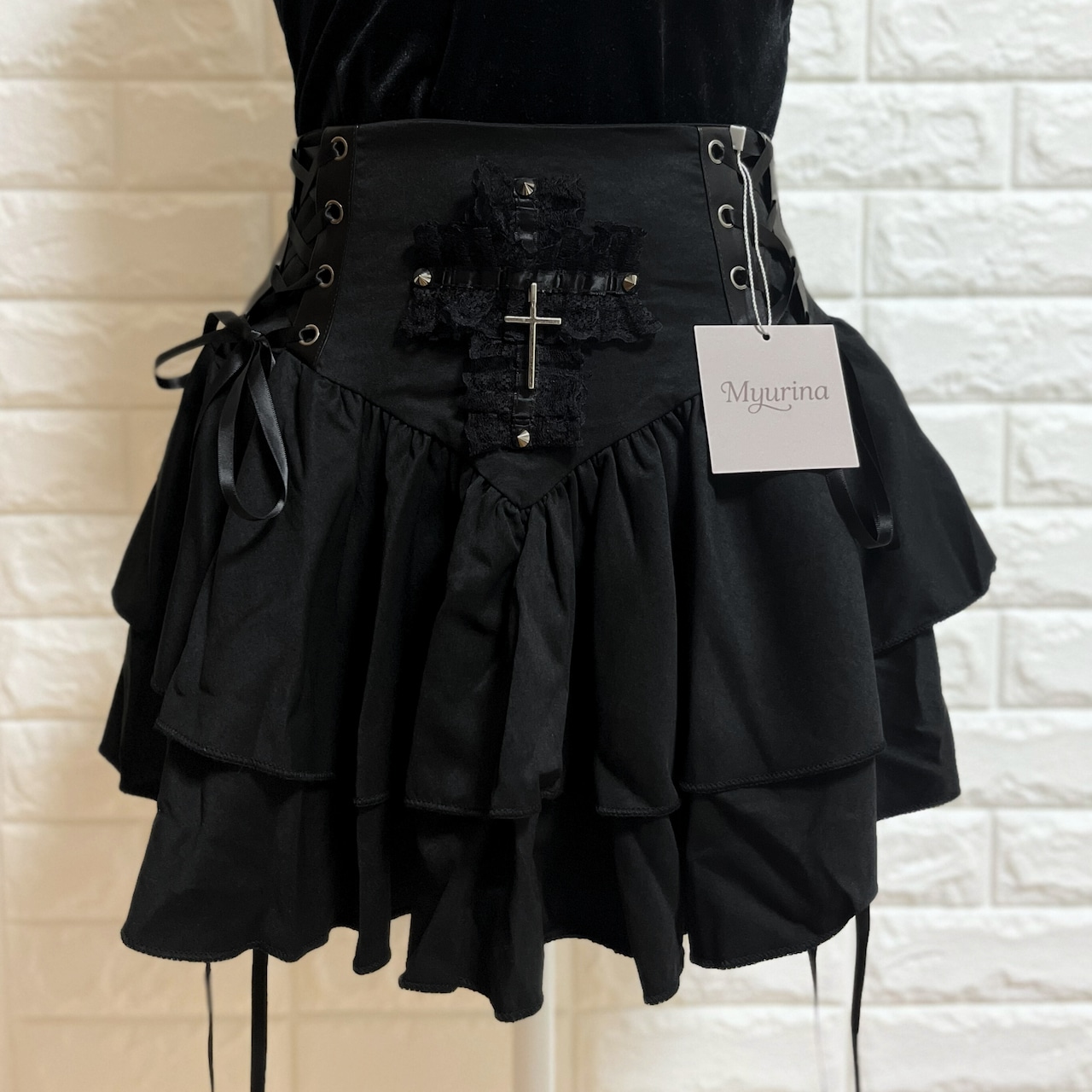 Myurina 十字架レースアップミニスカート フレアスカート ティアードスカート サブカル ロザリオ クロス コルセット 地雷系 量産型 ハイウエスト プリーツスカート 可愛い ロリータ 双子コーデ