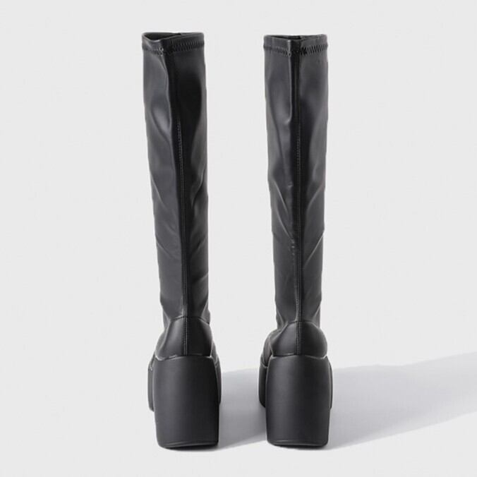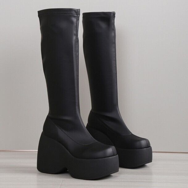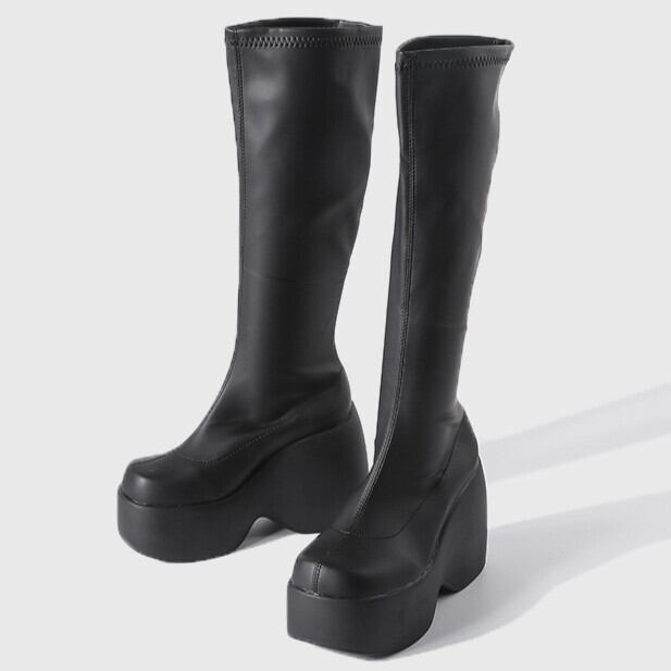 Myurina 厚底プラットフォームロングブーツ 黒 厚底ブーツ 美脚 スクエアブーツ ストレッチブーツ 秋冬レディース靴 サイドゴアブーツ モード系 ギャル y2k サブカル 量産型 地雷系 ゴスロリ
