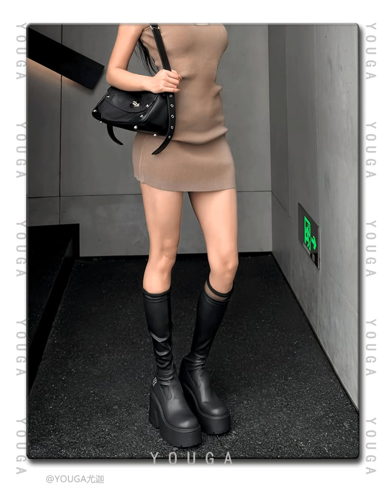 美脚効果抜群のストレッチ素材で、脚にぴったりフィットする厚底ロングブーツ。