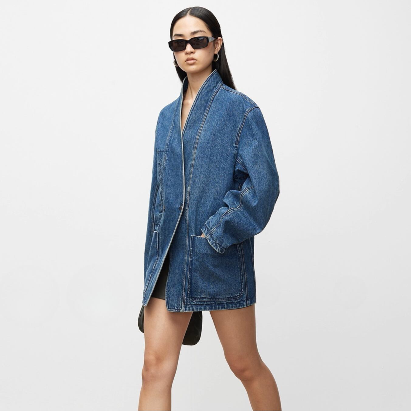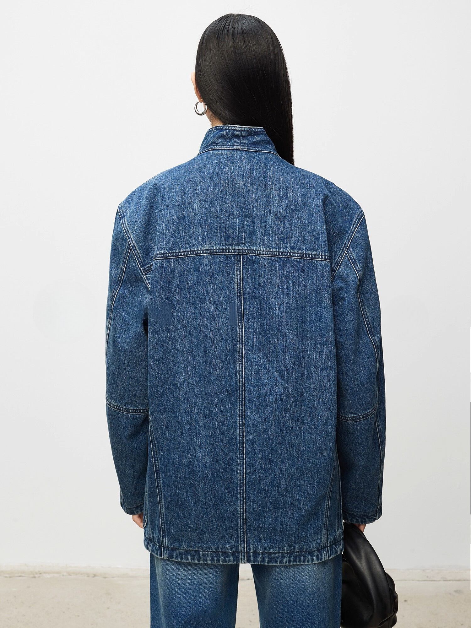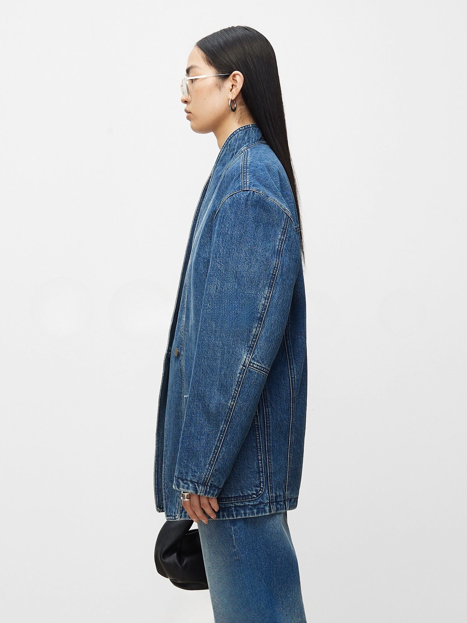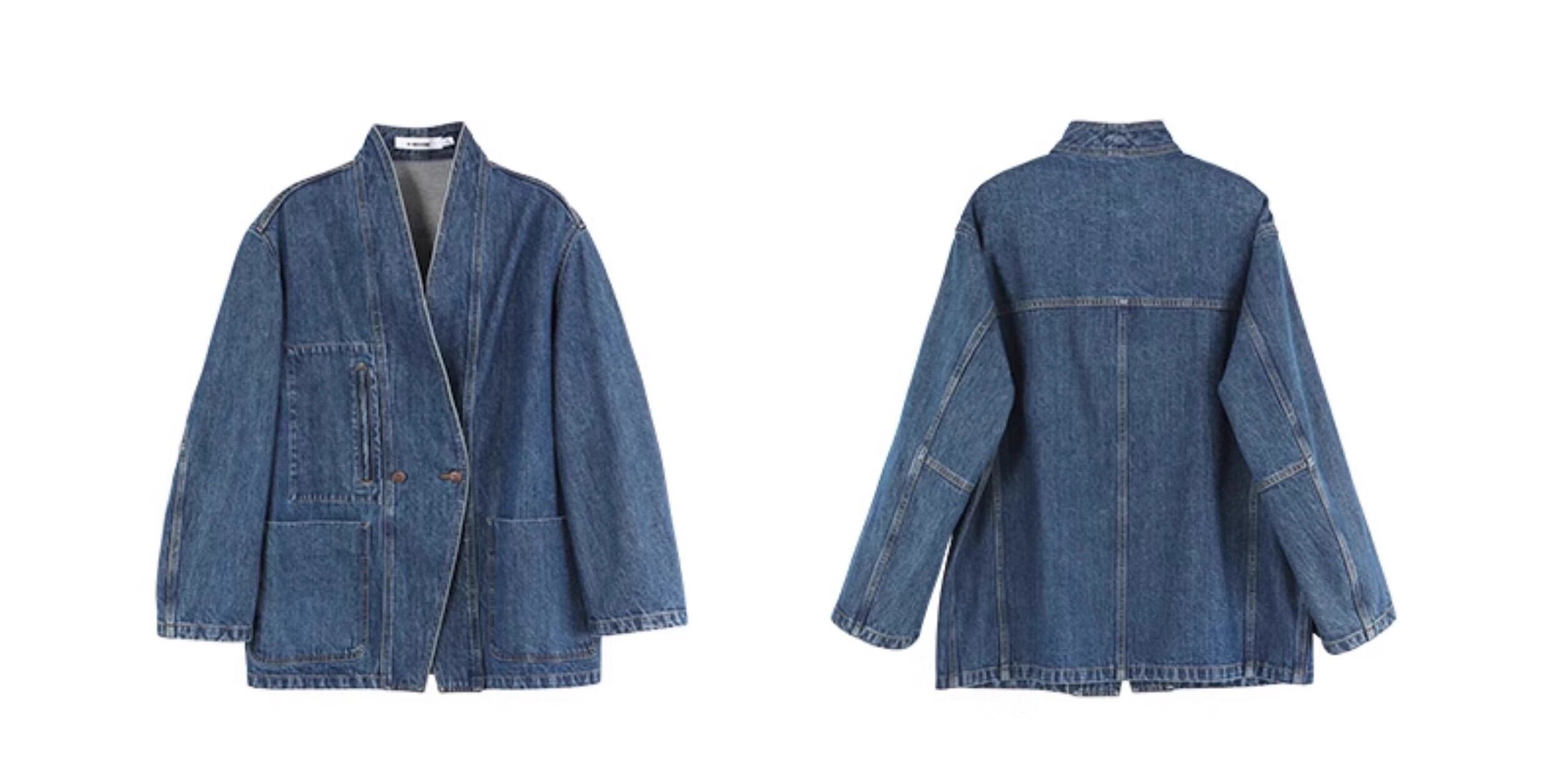 Myurina ノーカラーデニムジャケット Y2K 体型カバー レディース コート 秋冬アウター 襟なしジャケット ガウンコート モード系 ブルゾン カーディガン ジージャン