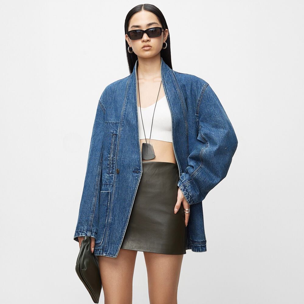 モードな雰囲気にも、カジュアルにも合わせられるデニム地のノーカラージャケット。