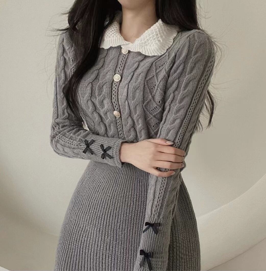 フィット感のあるニットに、編み模様とレース襟のディテールが魅力的なニットワンピース。ウエスト部分の切替デザインでスタイルアップ効果も抜群で、甘さと上品さを絶妙に両立した、秋冬の“お呼ばれ服”にぴったりな一着です⸜❤︎⸝