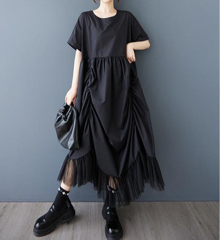 立体感のあるギャザードローストリングと、裾からのぞくチュールが魅力的な大人ワンピース。モード系、上品系、カジュアル系コーデにもぴったり。サラッと着れて体型カバーも出来る上に、1枚で華やかに決まる神アイテムです⸜❤︎⸝