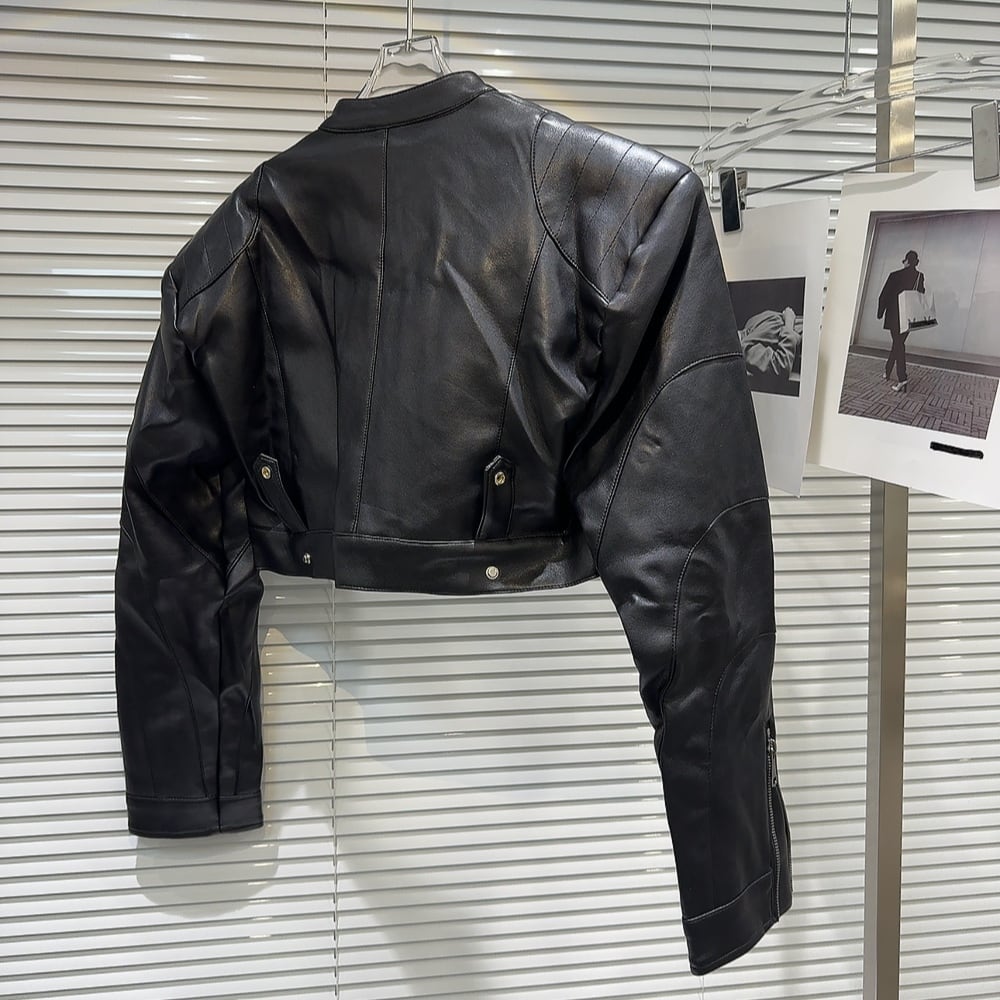 クールな印象を与えるクロップド丈のフェイクレザージャケット。ロングスリーブデザインとウエストを強調するシルエットでスタイルアップ効果抜群。軽めのフェイクレザー素材なので、秋冬〜春先までロングシーズン着用可⸜❤︎⸝