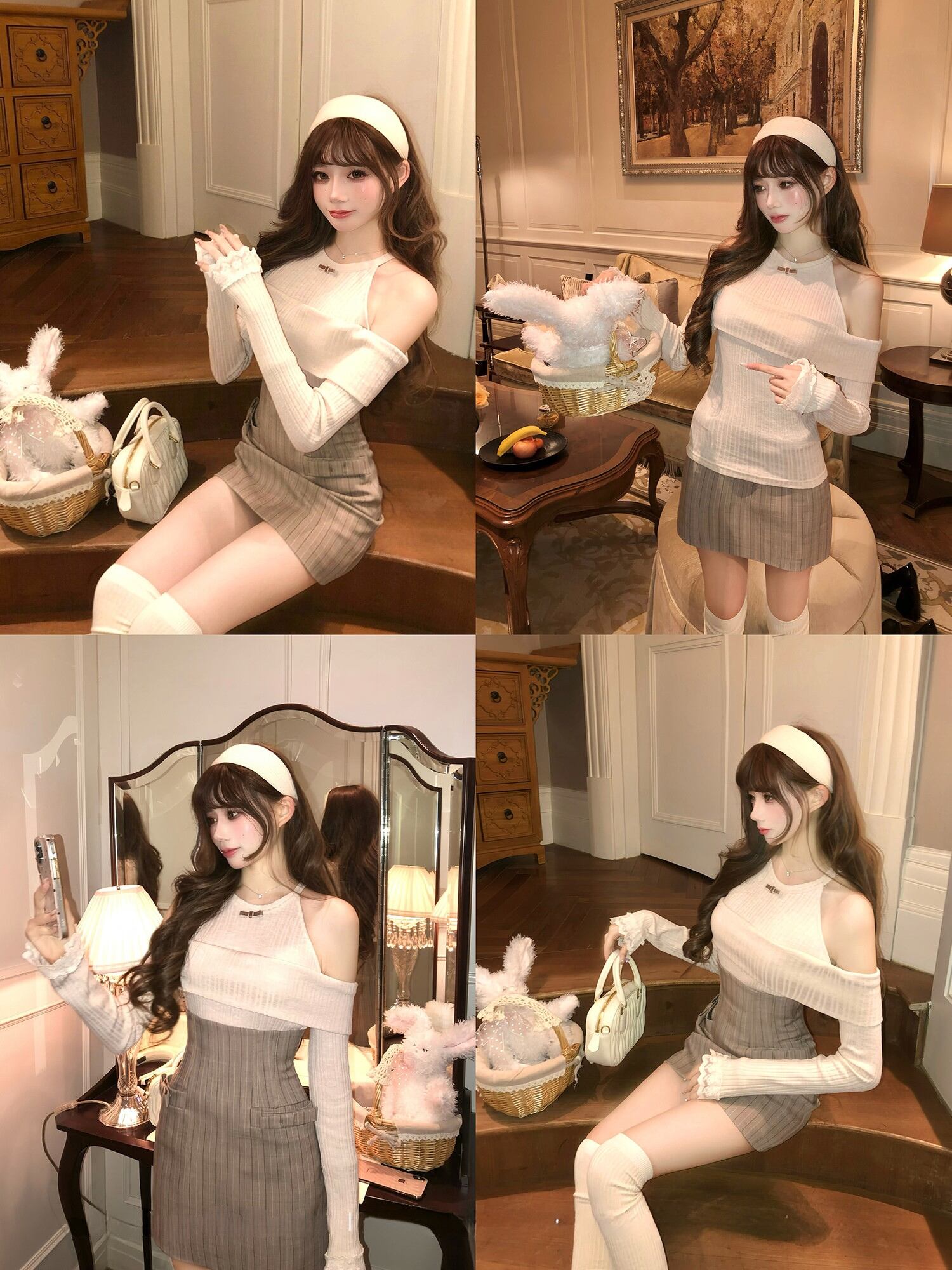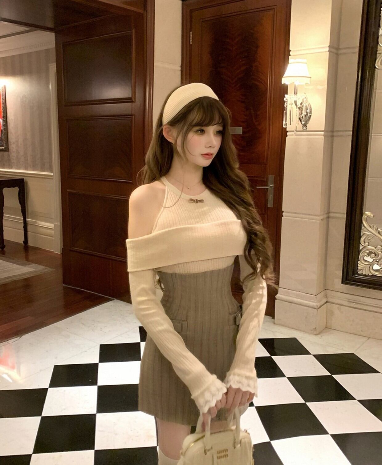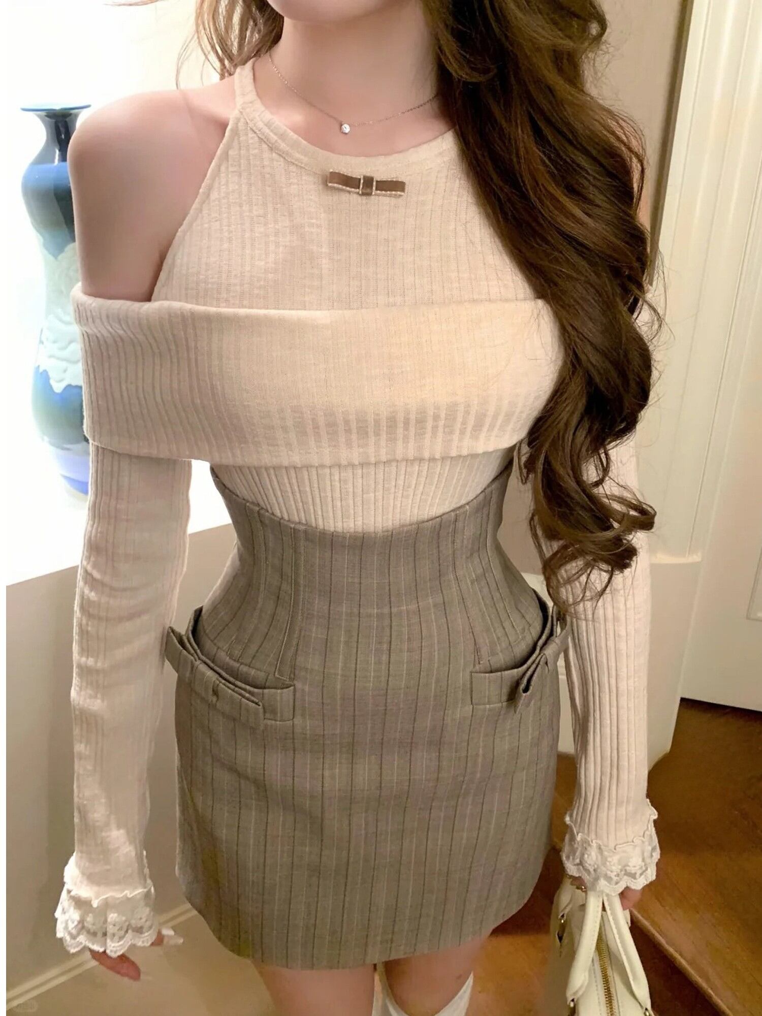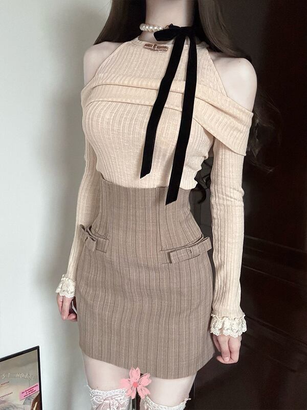Myurina オフショルダー×タイトスカートセットアップ miu系 2点セット オフショルニット オープンショルダー マーメイドスカート 秋冬レディース服 ハイウエスト ストライプスカート 韓国っぽ k-pop トラッドカジュアル 量産型 ワンホン