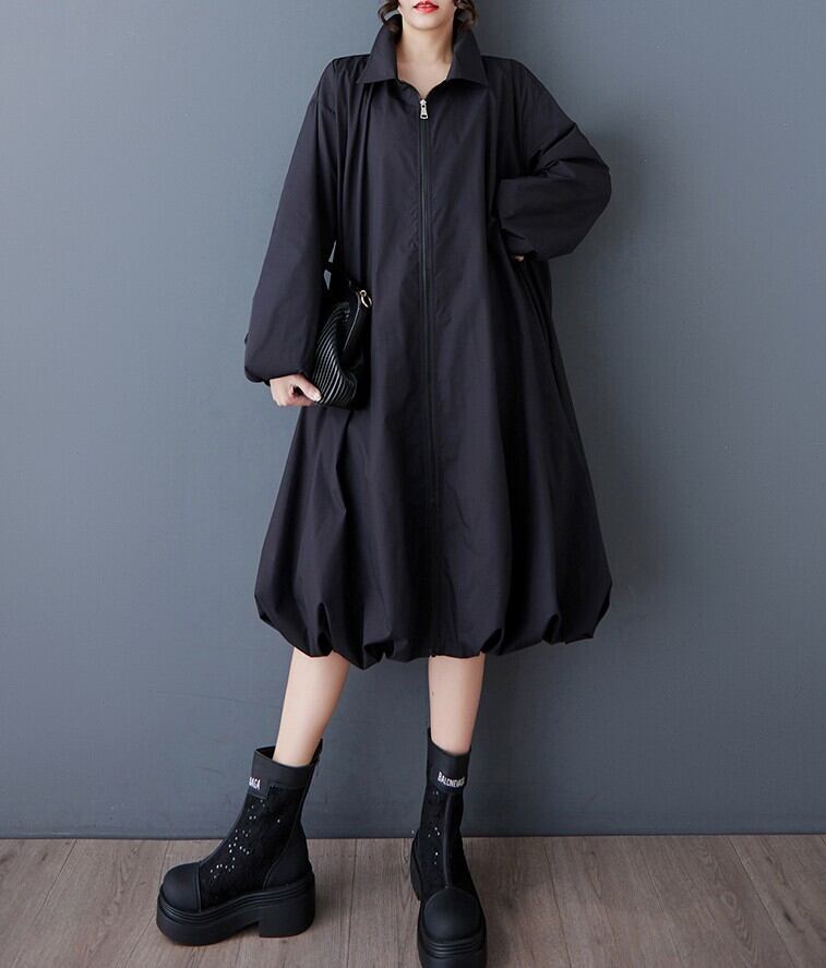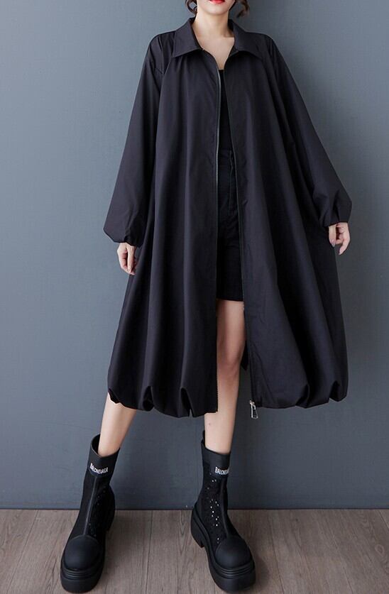 Myurina バルーンロングワンピース 黒 モード系 体型カバー 襟付き シャツワンピース ゆったり 大人カジュアル マキシ丈 オーバーサイズ コクーンコート ロングコート ジャンパースカート オーバーオール Aライン オールシーズン レディース服
