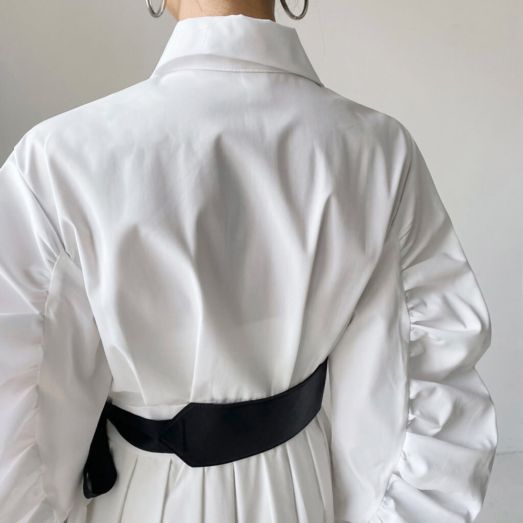 立体感ギャザードスリーブと、ウエストから裾にかけて広がるプリーツデザインが魅力的な大人ワンピース。モード系、上品系、カジュアル系コーデにもぴったり。幅広なブラックベルトでウエストマークすれば、メリハリのあるスタイルが完成しスタイルアップ効果も抜群です。