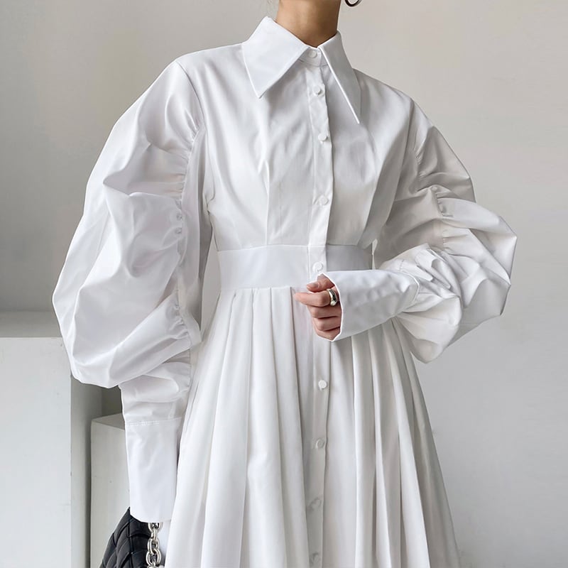 Myurina ギャザースリーブシャツワンピース モード系 襟付きワンピース 体型カバー 大人カジュアル 切り替えワンピース Aライン フレアワンピース オールシーズン レディース服 プリーツ