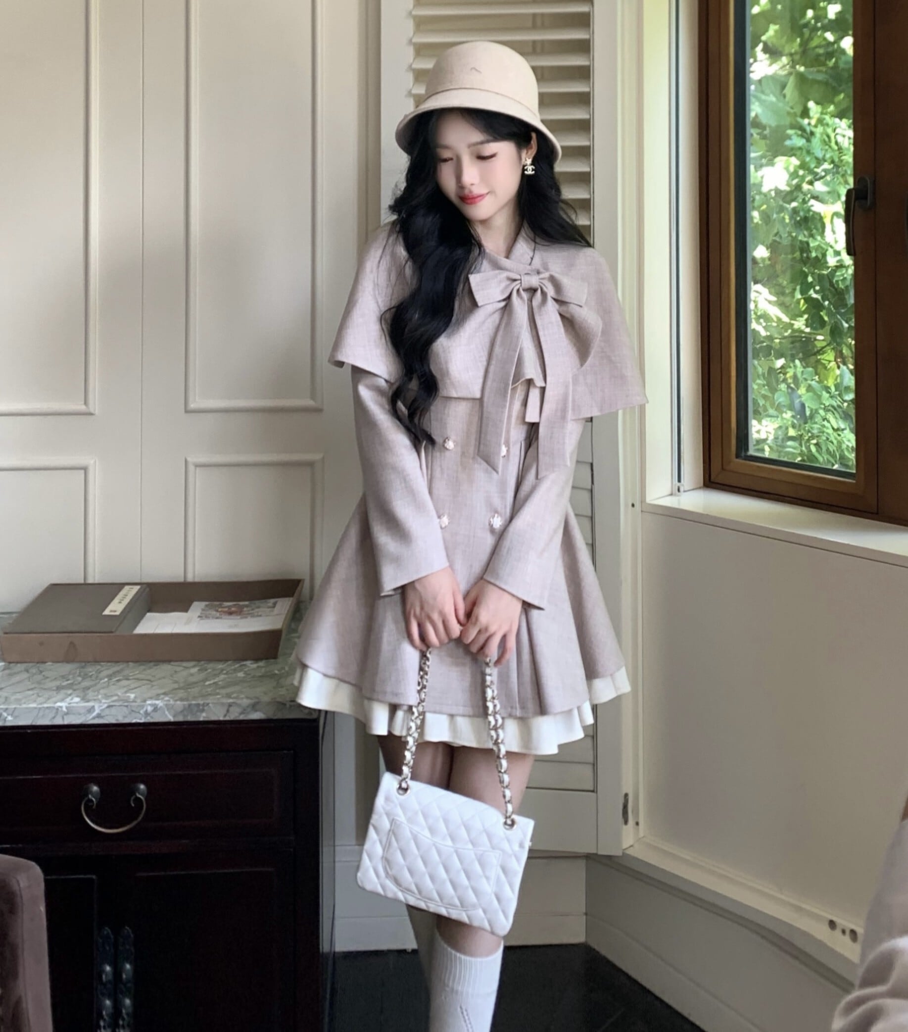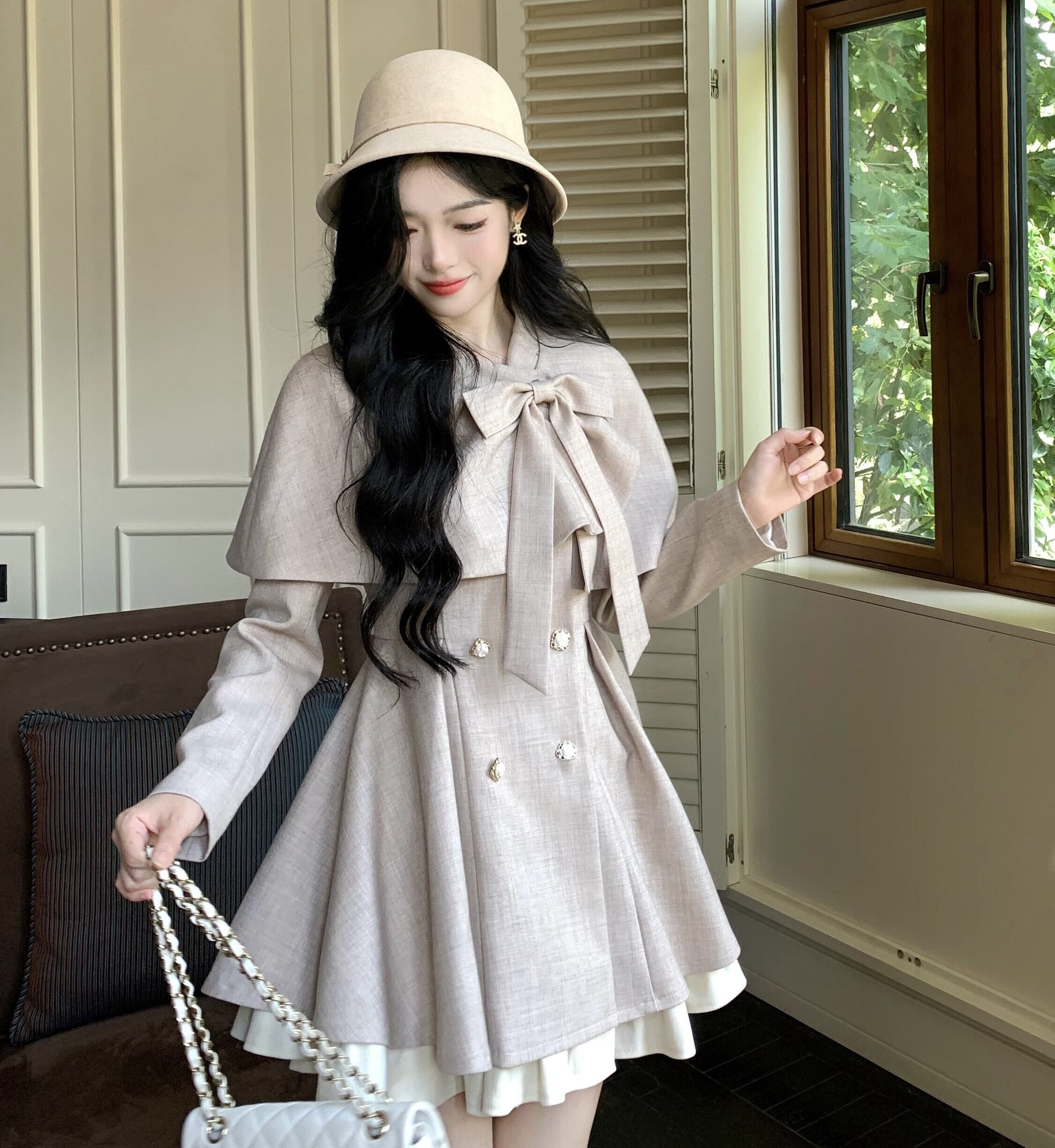 Myurina リボンフレアトレンチコート ケープ付き 2点セット miu系 量産型 ワンピースコート ロングコート レディース 秋冬アウター ロリータ 甘ロリ 地雷系 韓国