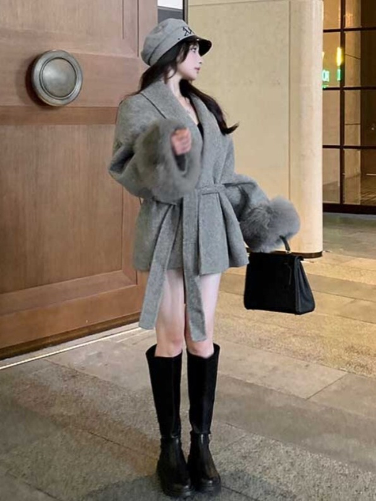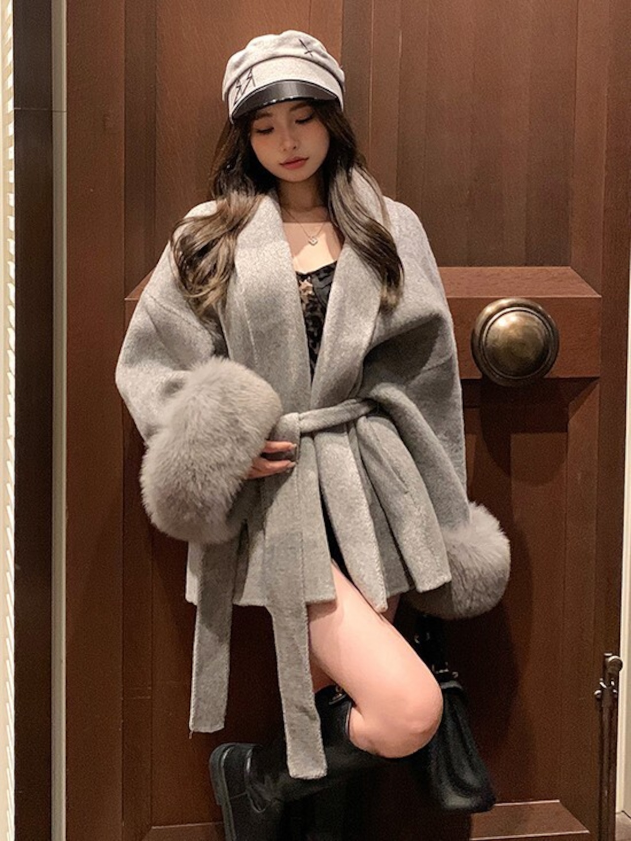 Myurina 袖ファーガウンコート ウエストリボン付き miu系 フェイクファー ローブコート ショートコート レディース 秋冬アウター ジャケット 韓国 ノーカラーコート 量産型 上品 平成ギャル パーティー