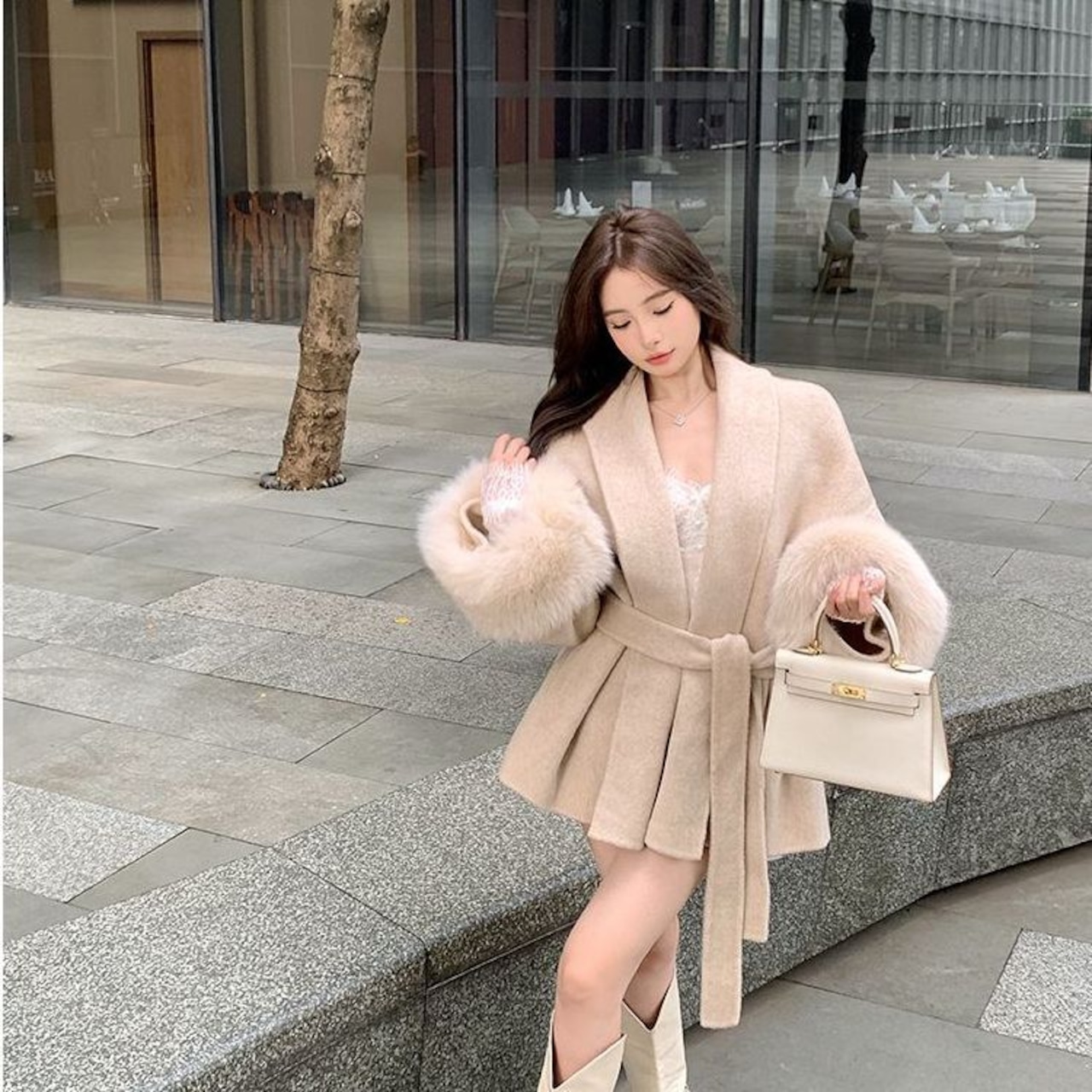 やわらかなガウンシルエットに、ボリュームたっぷりの袖口ファーがエレガントに魅せてくれる一枚。ゆったり軽やかな着心地な上、ウエストリボンでフェミニンにもカジュアルにもアレンジ可能な万能アイテムです⸜❤︎⸝