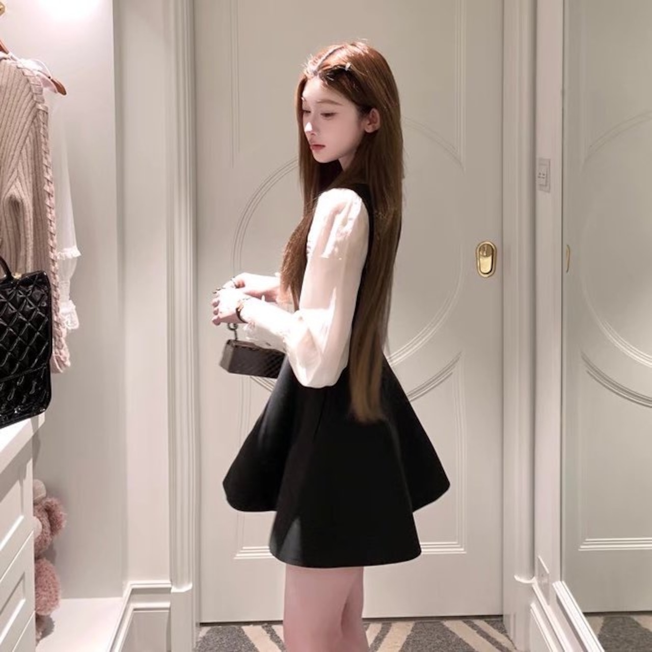Myurina 長袖シフォンフリルワンピース ミニワンピース Aラインワンピース 黒 長袖ワンピース フリルワンピース 襟付きワンピース 秋冬 レディース服 オタク 参戦服 量産型 夏服 サテン パーティー 結婚式