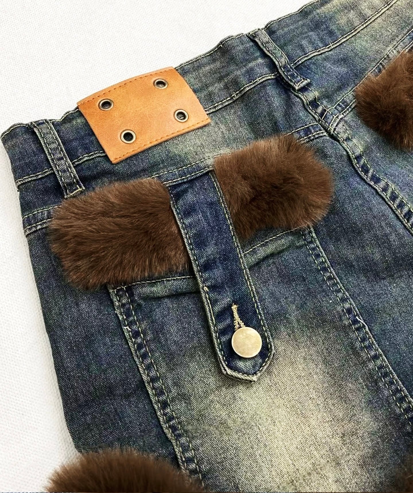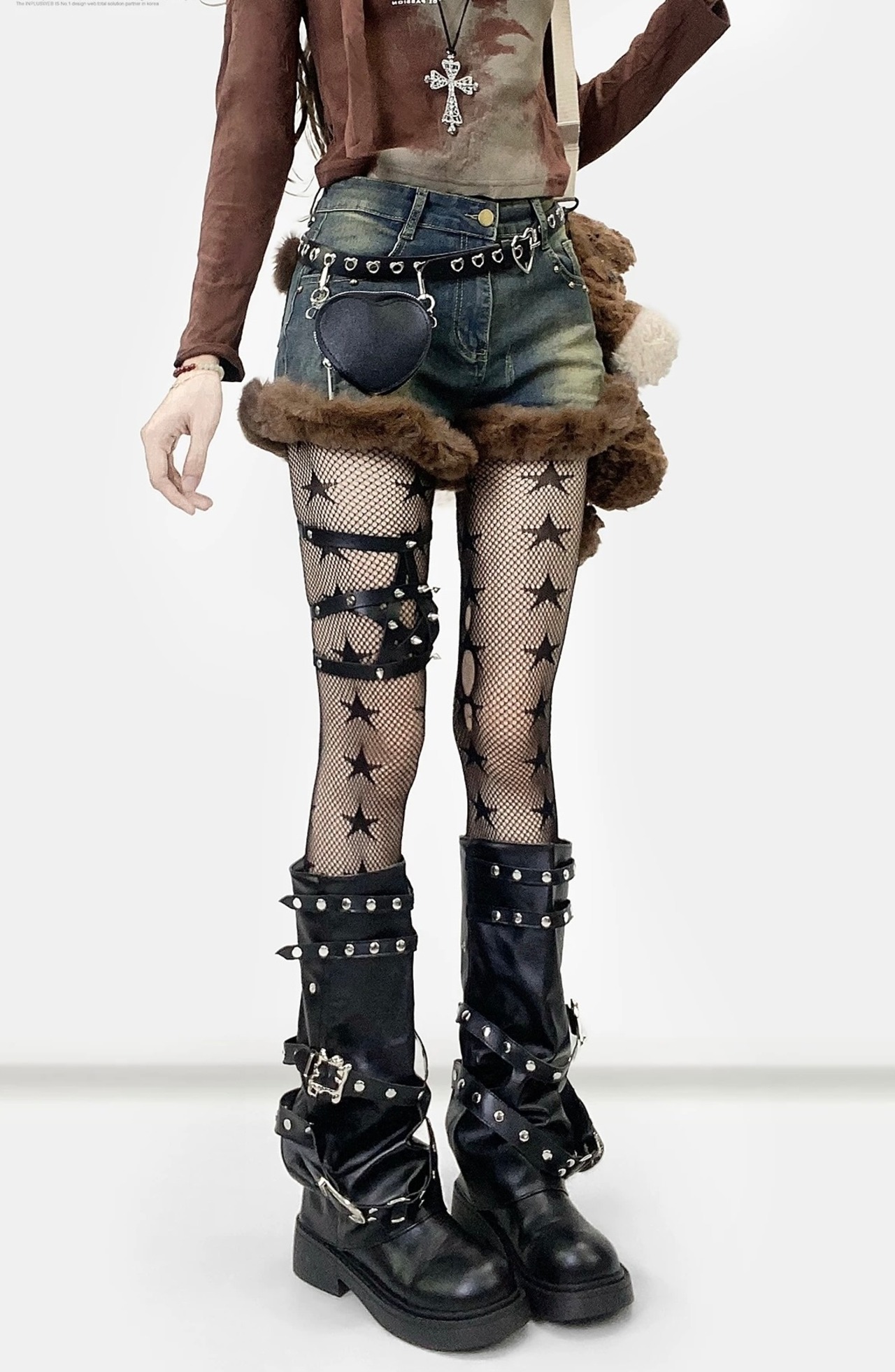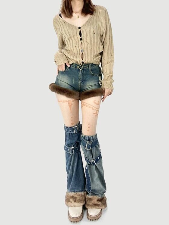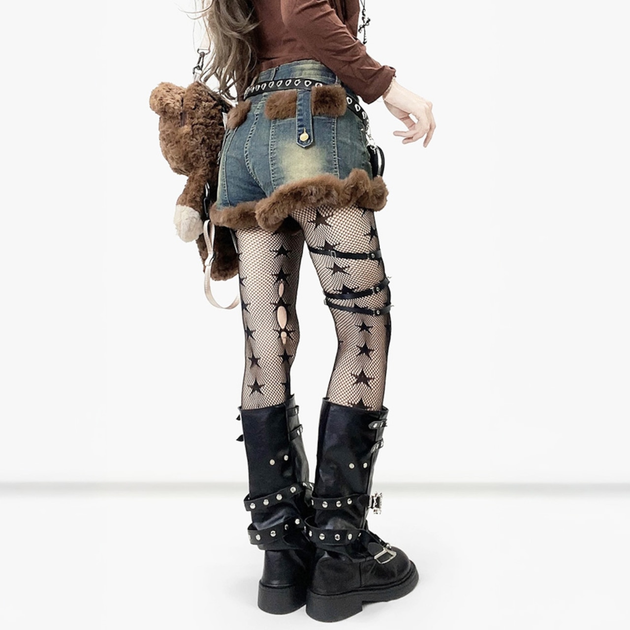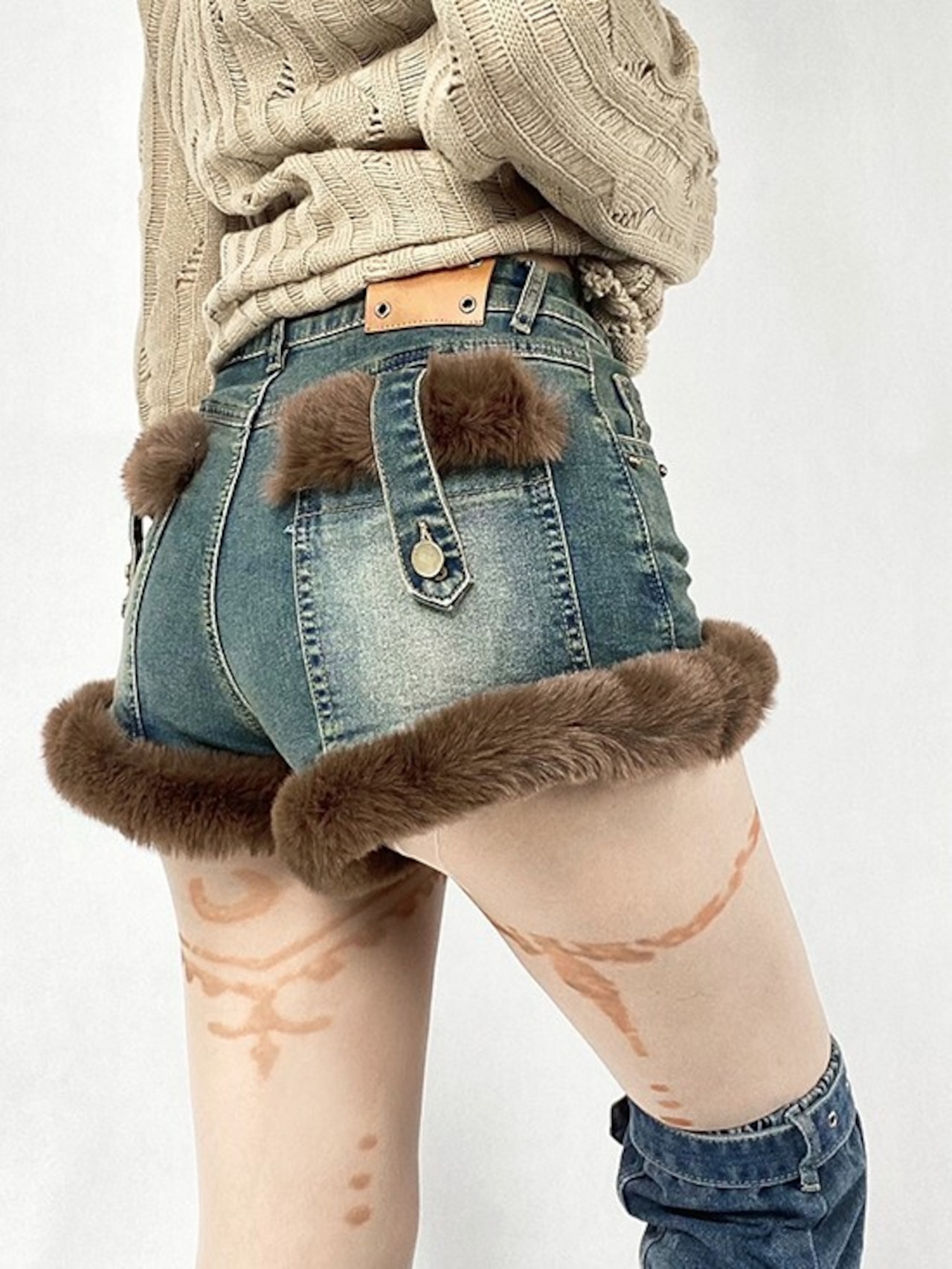 Myurina ファーショートデニムパンツ Y2K ショーパン 短パン フェイクファー 秋冬レディース服 ジーンズ 平成ギャル 黒ギャル フェアリーグランジ 00s