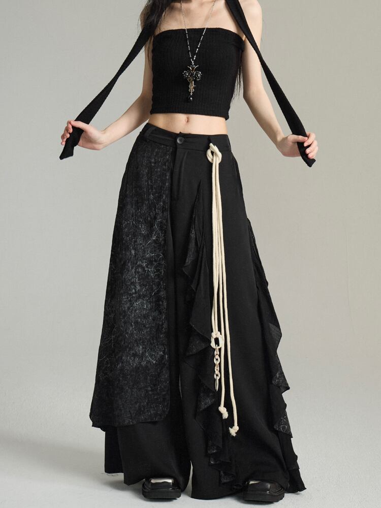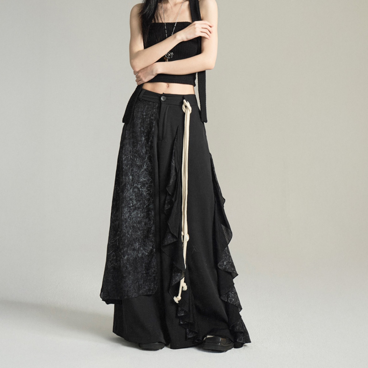 異素材の切り替えとアシンメトリーデザインが特徴のワイドパンツ。和モードを感じさせる雰囲気で、個性派コーデに取り入れやすい一本。ダークコアやゴシック系、ストリート系のコーデにも合う神アイテムです♡