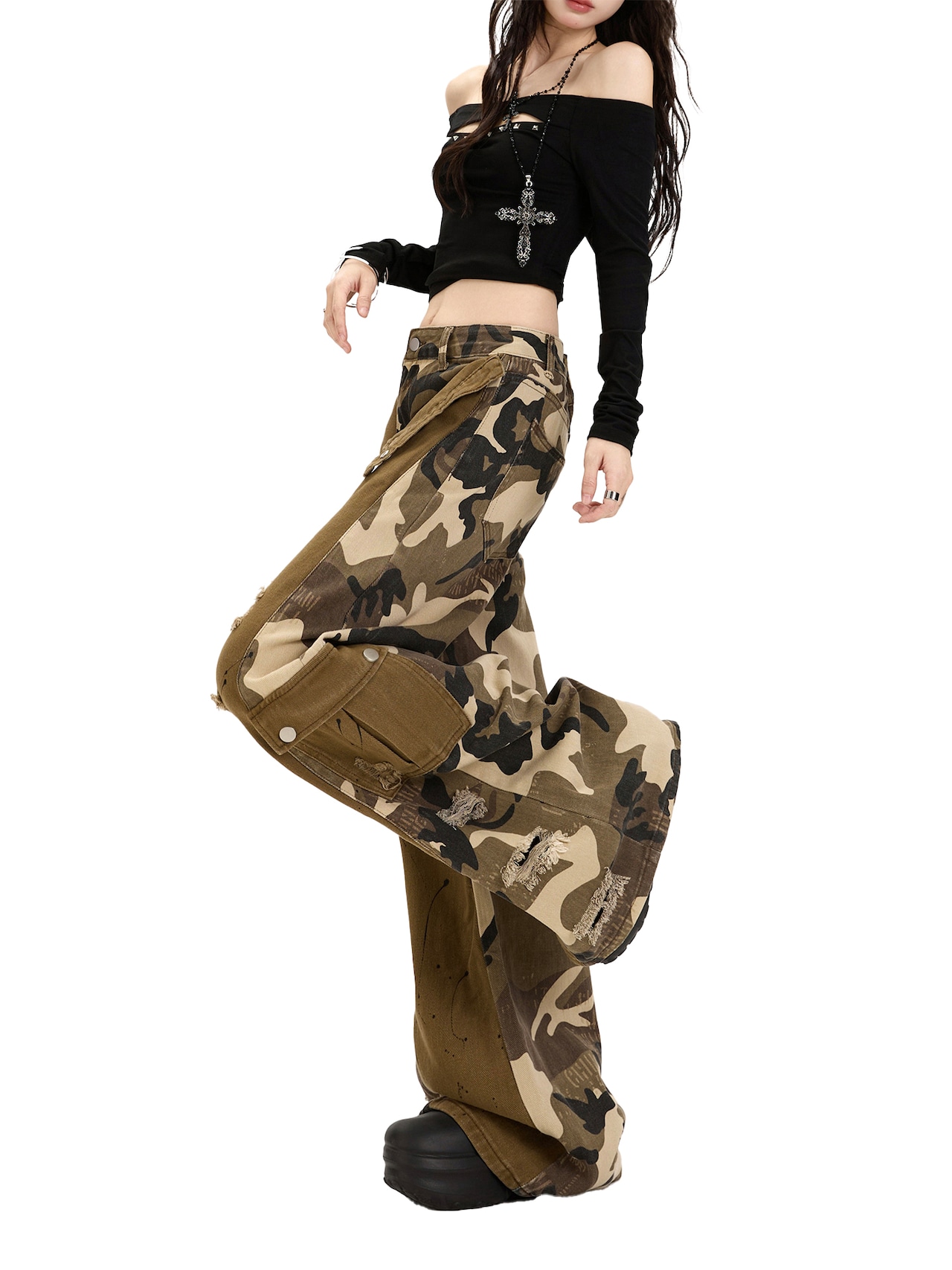 Myurina カモフラージュ ワイドカーゴパンツ ストリート系 迷彩柄 ミリタリーパンツ ローウエスト バギーパンツ ワイドパンツ ワークパンツ Y2K 平成ギャル 00s
