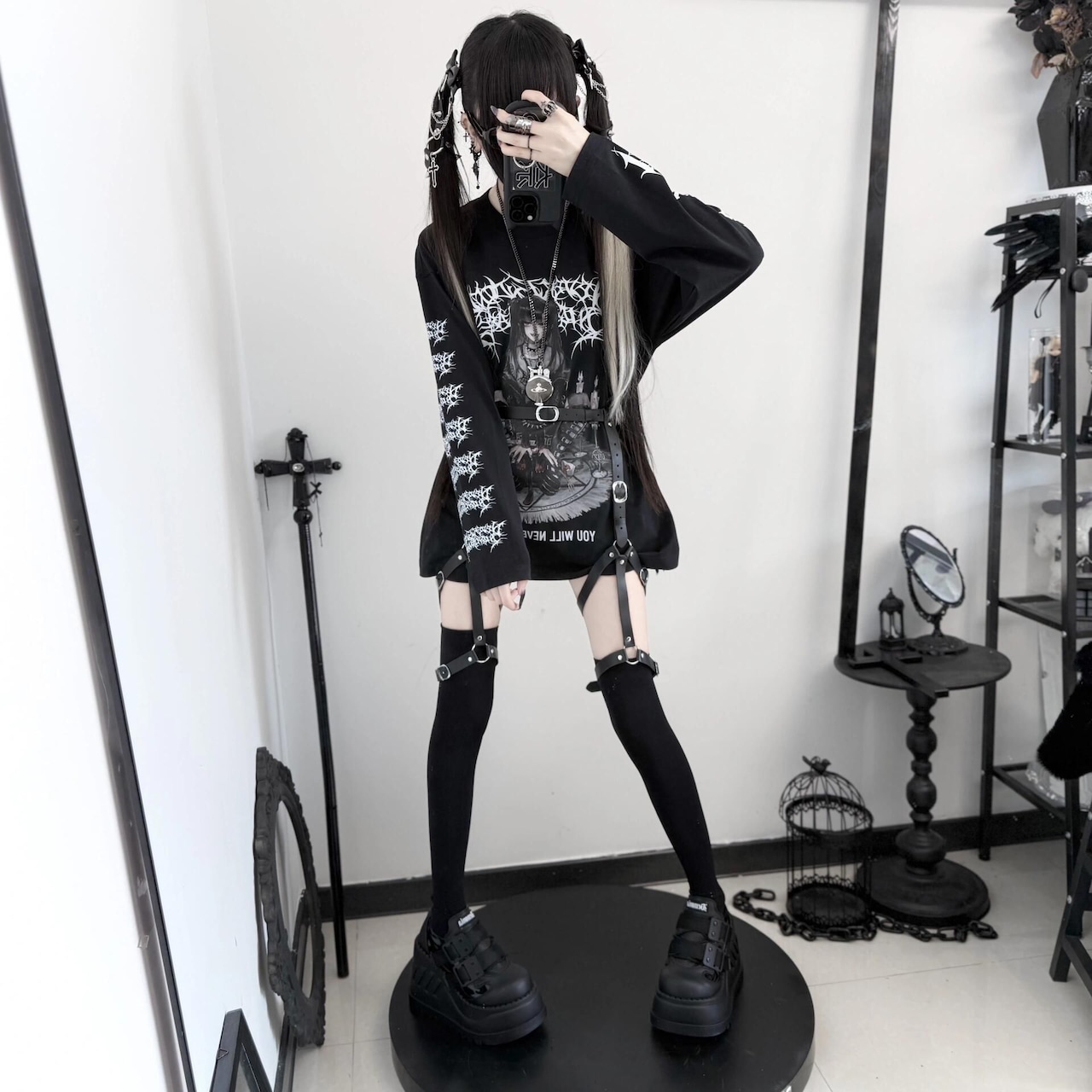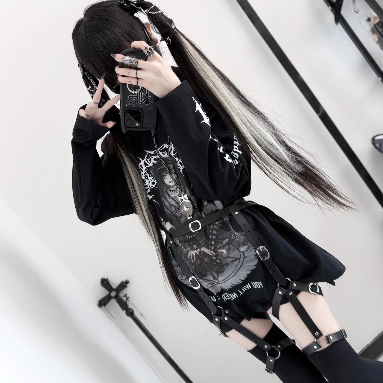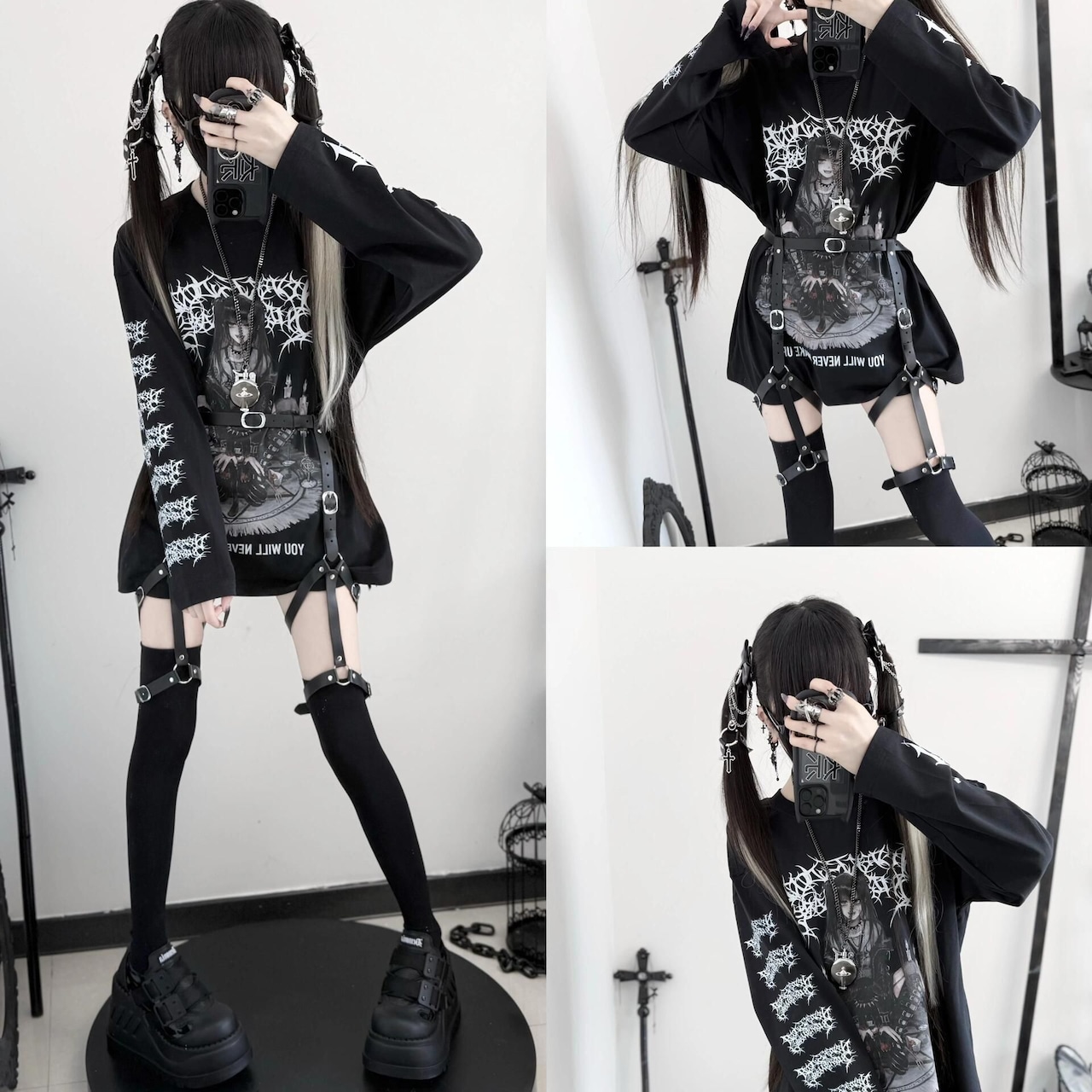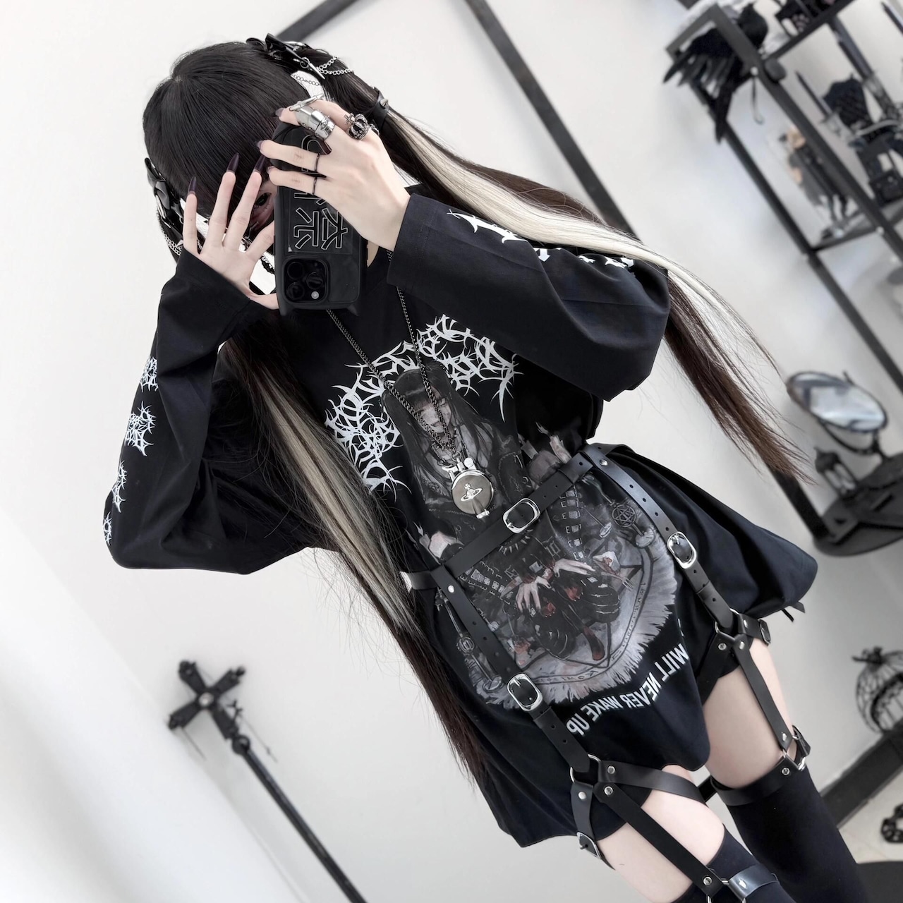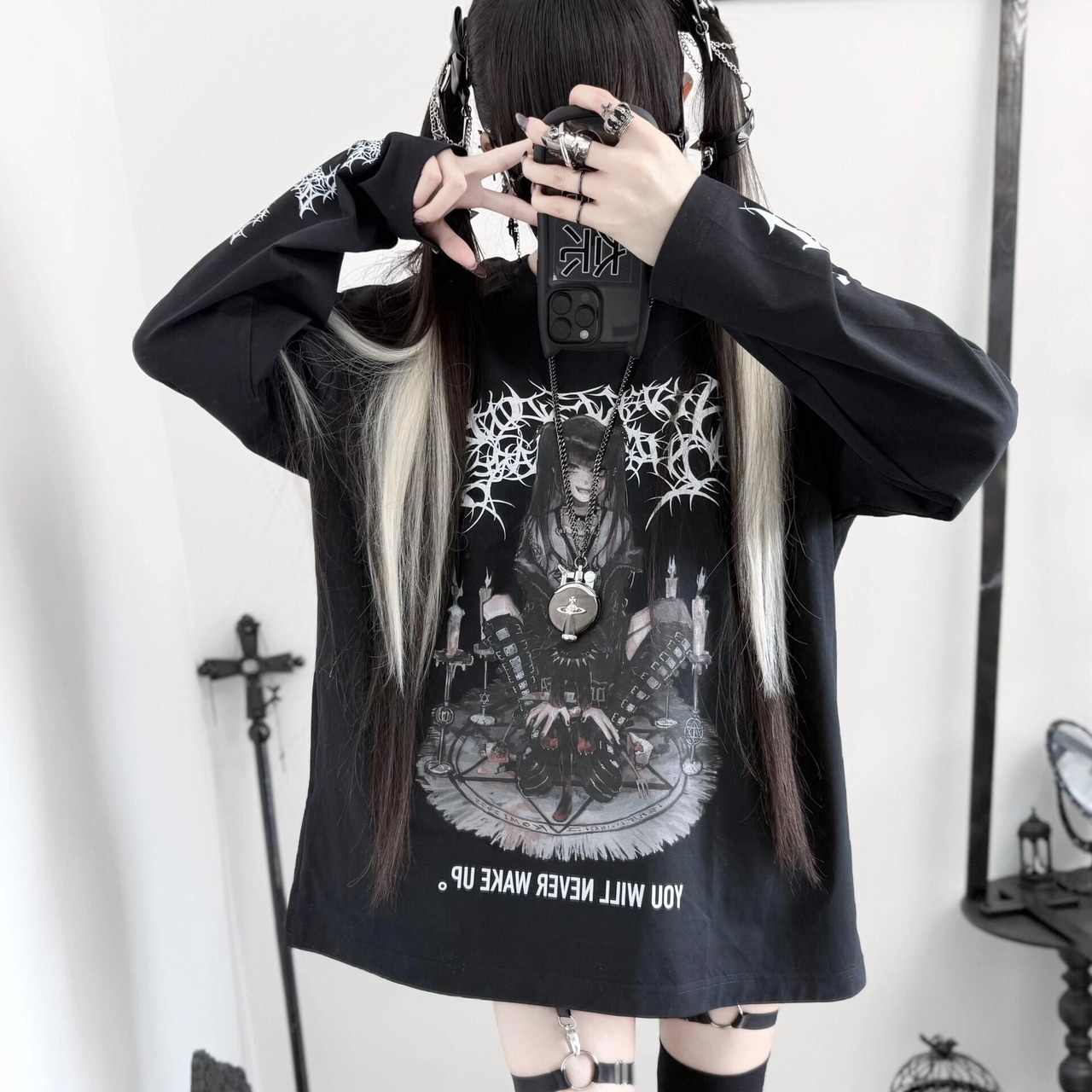 大胆なダークイラストと袖プリントが印象的なルーズシルエットのロンT。男女問わずユニセックスで着用可能で、ストリート感とゴシック感を兼ね備えた存在感抜群の一枚。