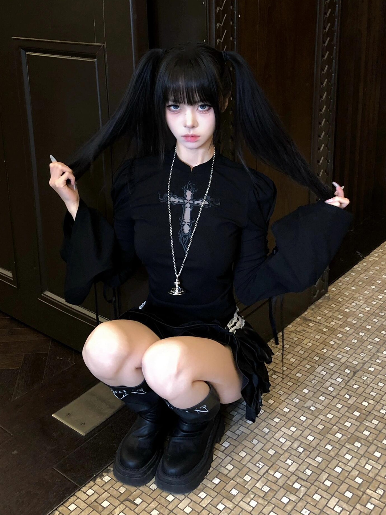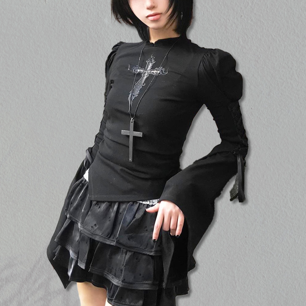 Myurina 十字架ベルスリーブシャツ y2k ピチT ゴスロリ 長袖Tシャツ カットソー ダークコケット 地雷系 ロザリオ クロス 病みかわ 平成ギャル 量産型