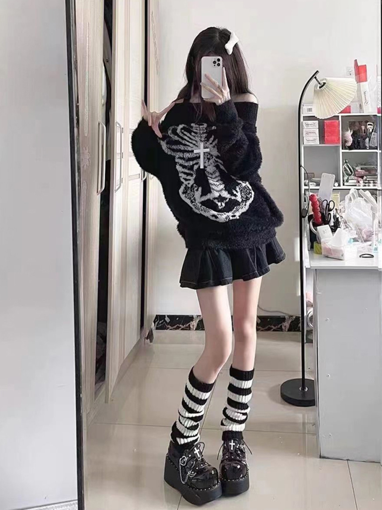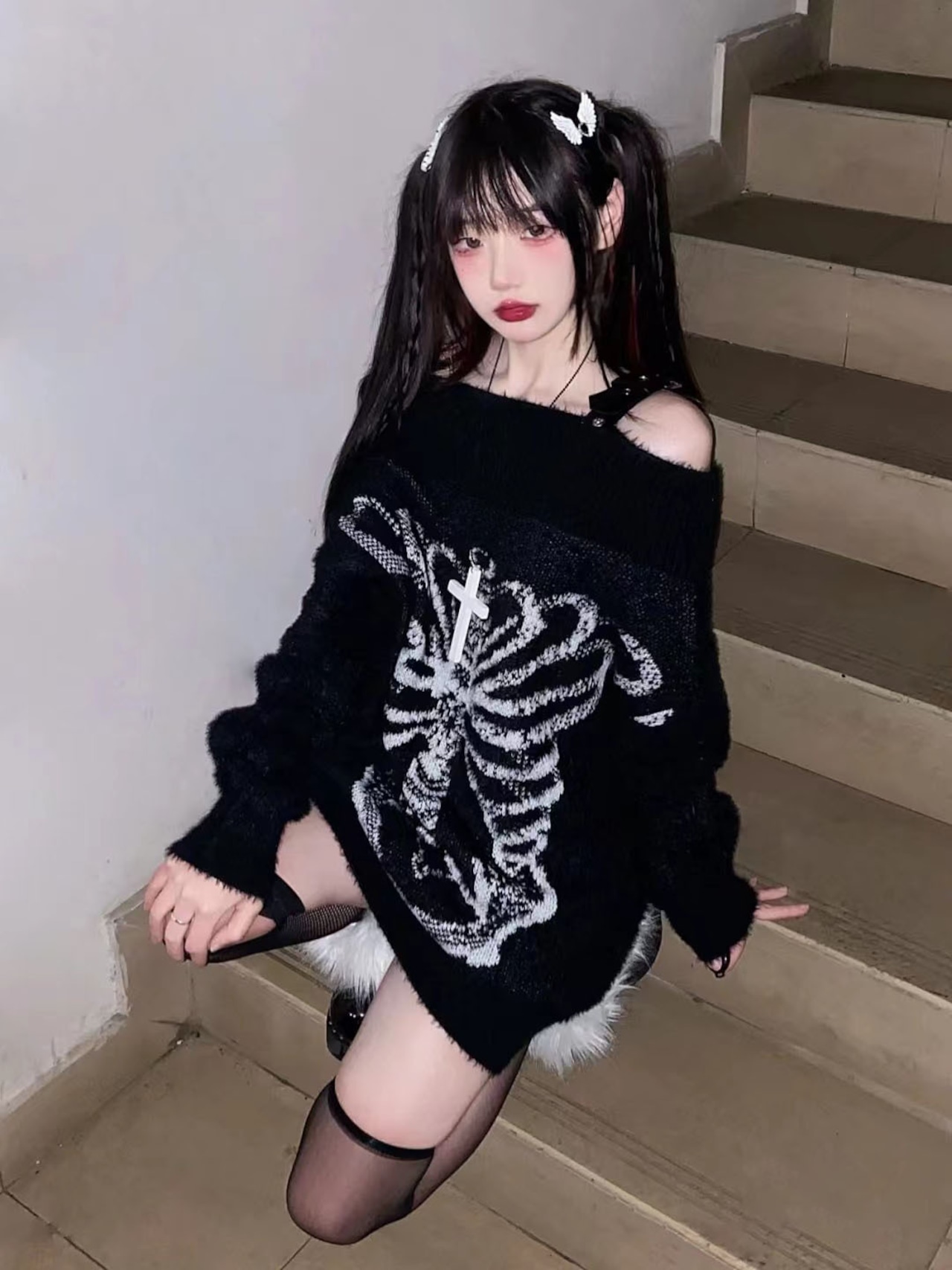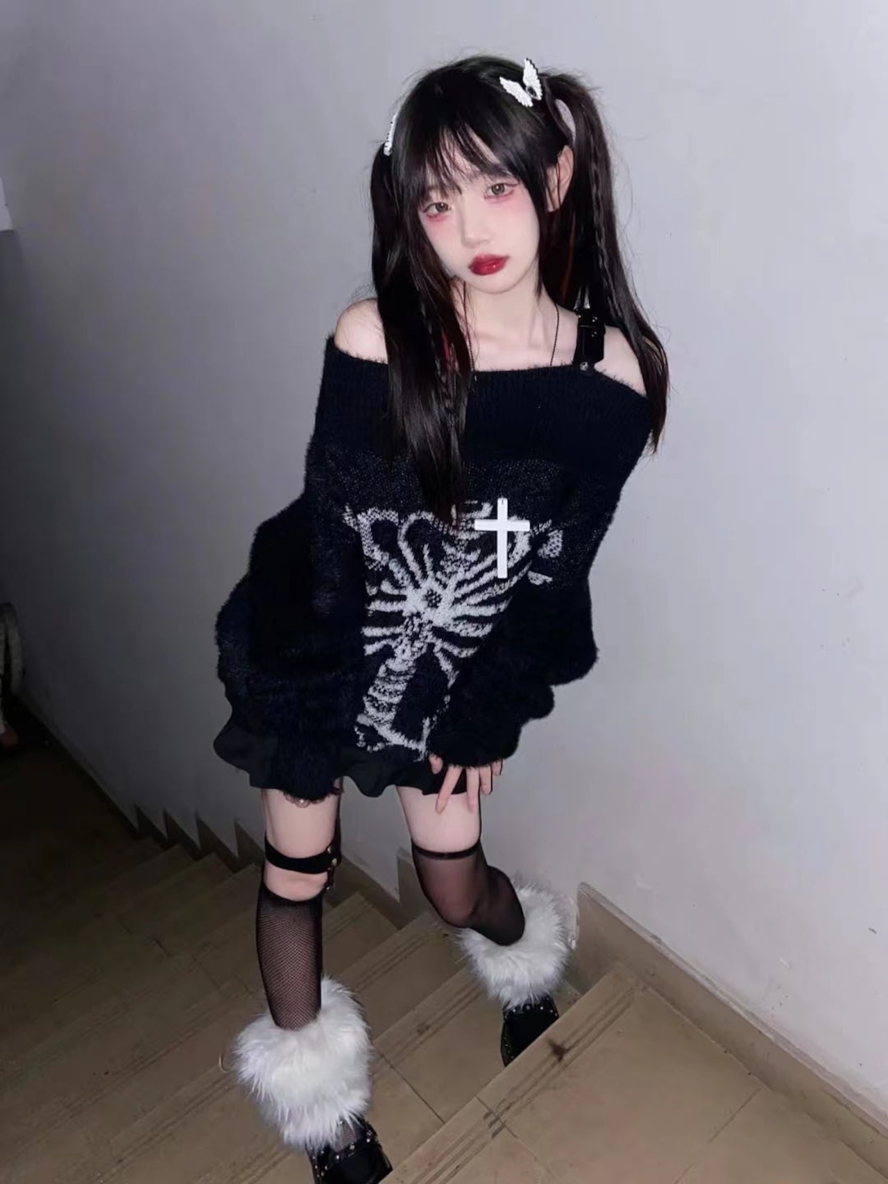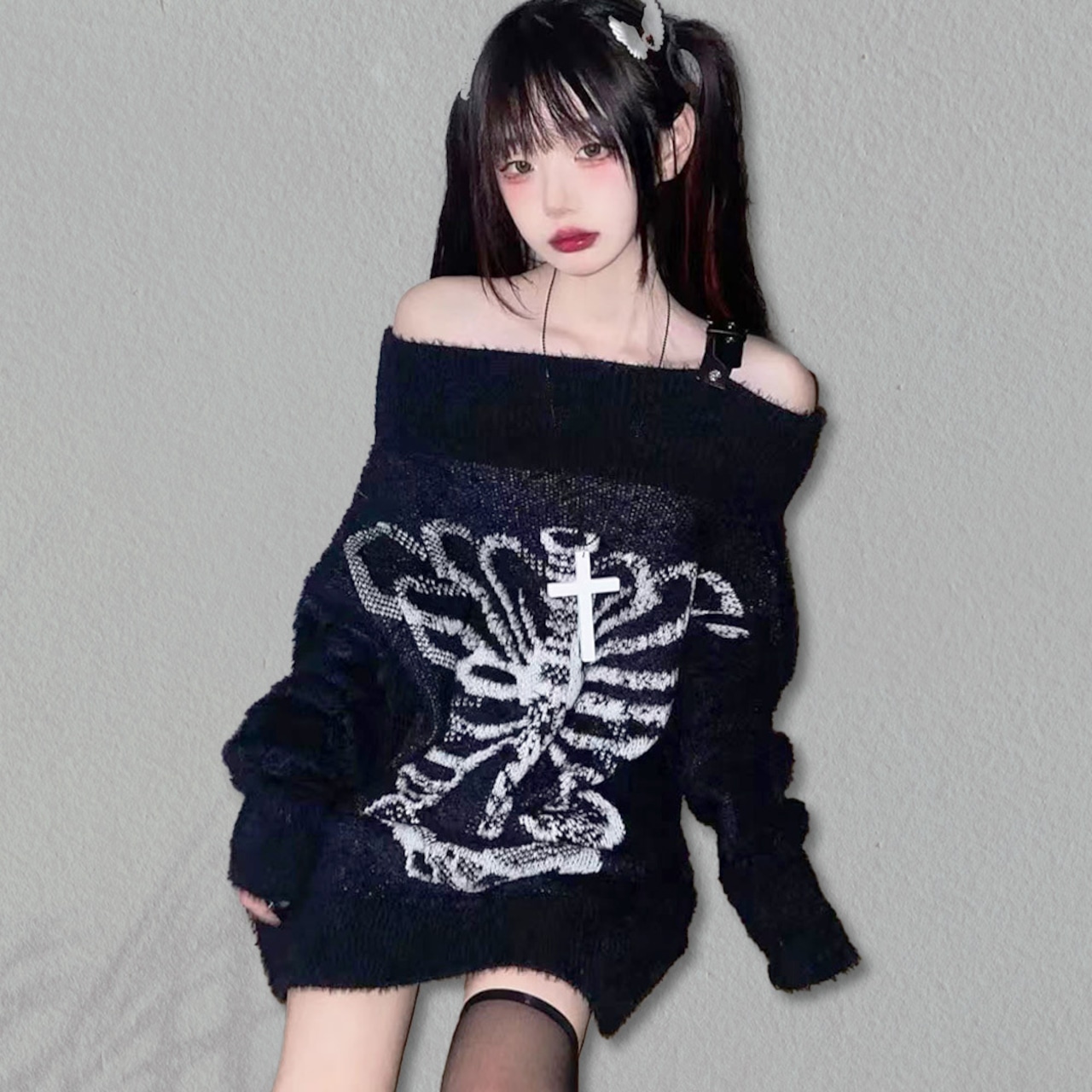 Myurina ボーンオフショルニット Y2K 長袖ニット オフショルダー オーバーシルエット ビッグシルエット セーター ニットワンピース 秋冬レディース服 地雷系 天使界隈 平成ギャル 00s