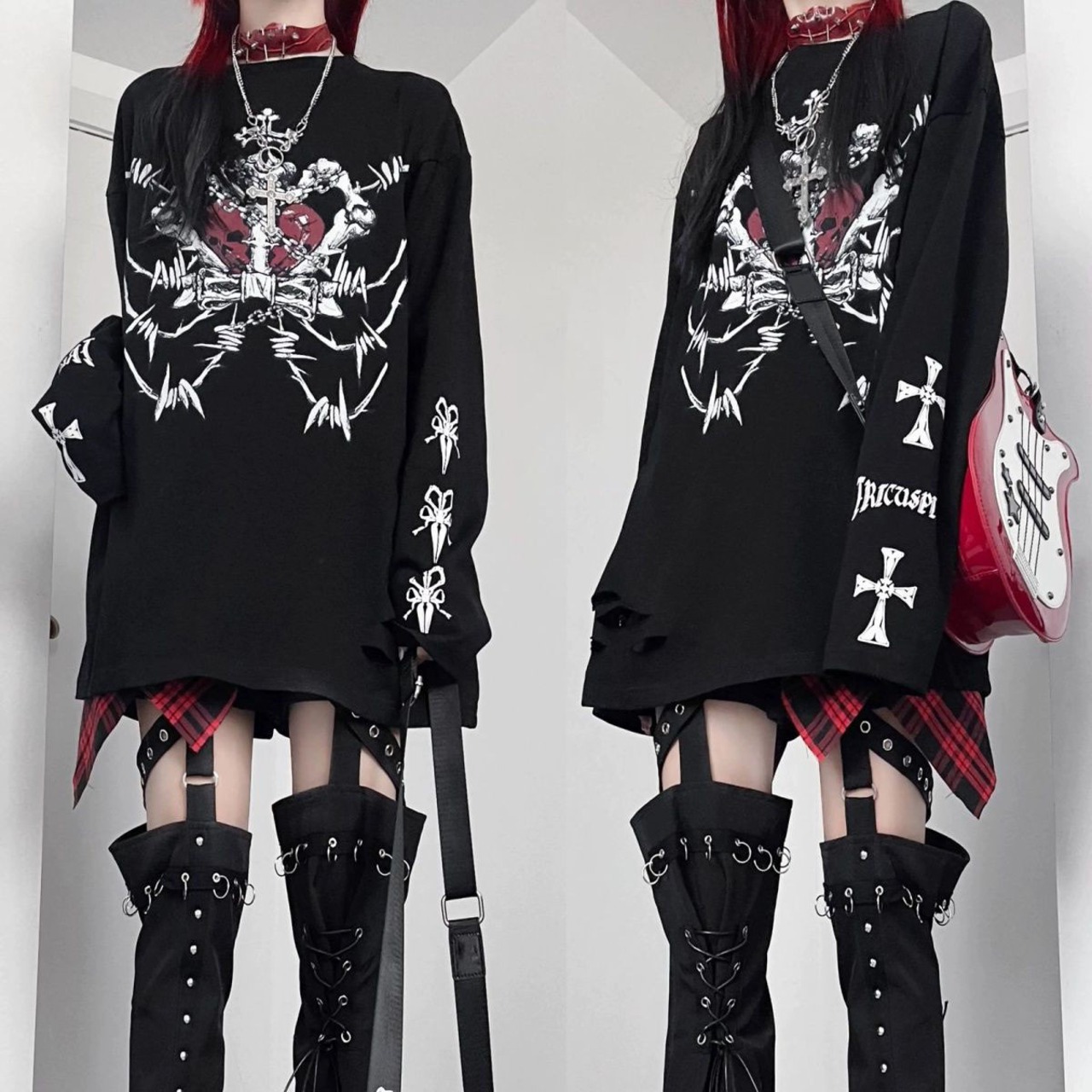 クロスやエンブレム柄のプリントを大胆にあしらったロングスリーブトップス。袖の広がったベルスリーブが存在感を高め、ゴシックな雰囲気を強調します。動くたびに映えるデザインで参戦服にもピッタリ。長袖Tシャツだけだと物足りないと感じる方にオススメの一枚です♡