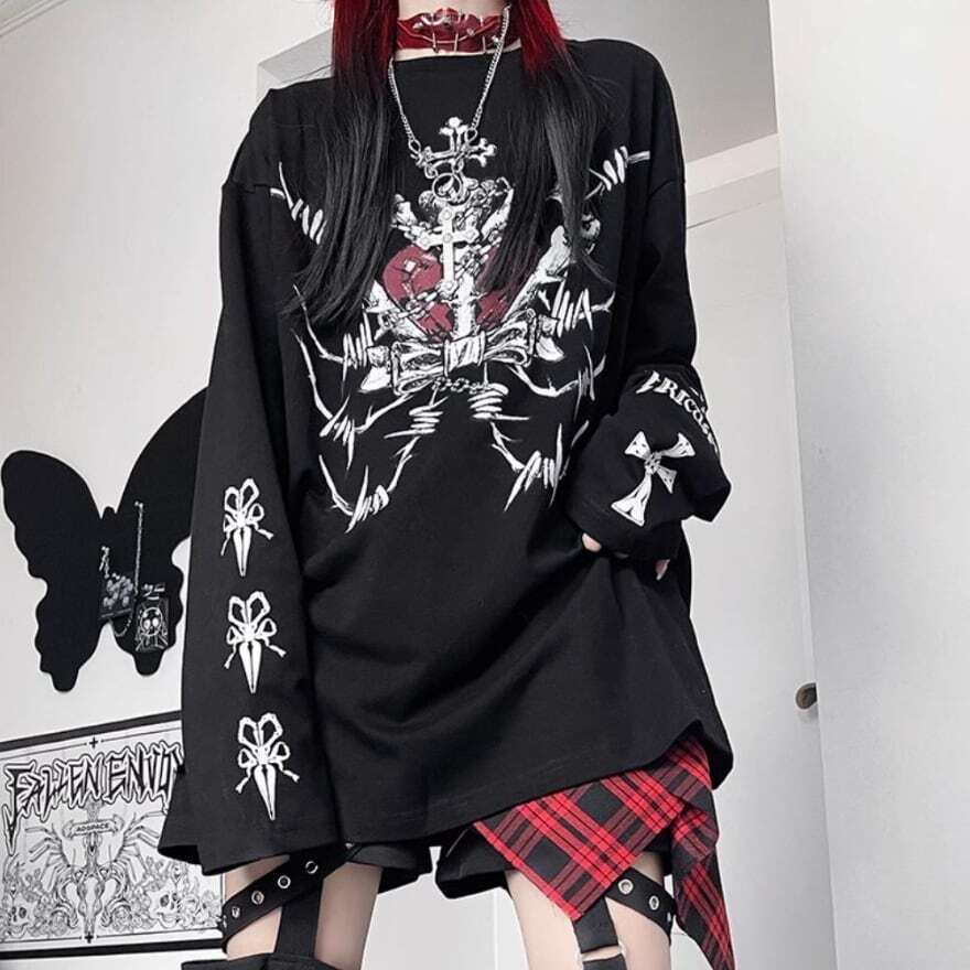 Myurina パンクグラフィックプリントロンT ストリート系 袖ロゴ 長袖Tシャツ オーバーシルエット プルオーバー パンクデザイン y2k メンヘラ カットソー 地雷系 サブカル ロザリオ クロス 平成ギャル ゴスロリ 量産型