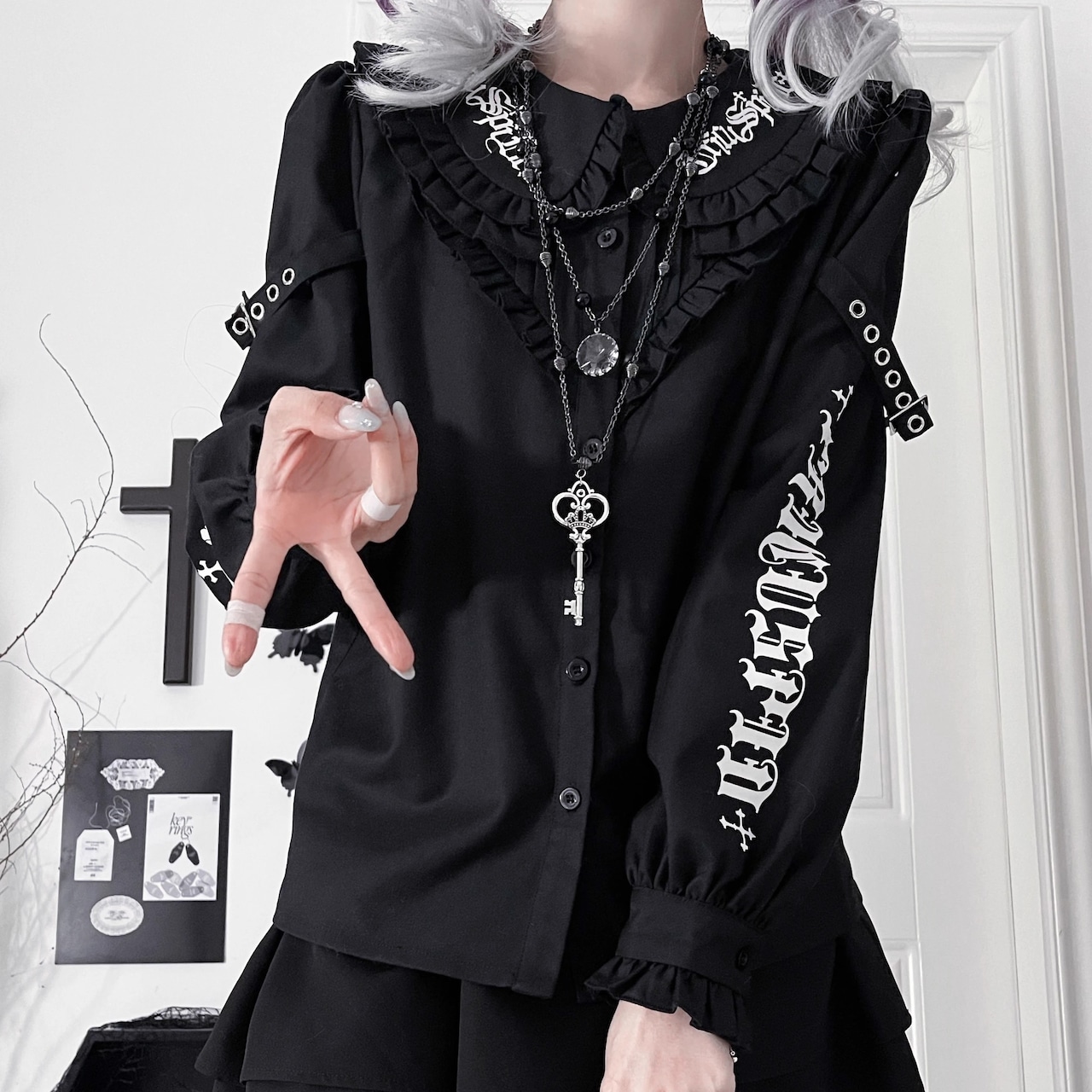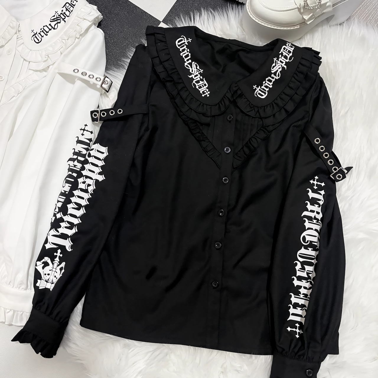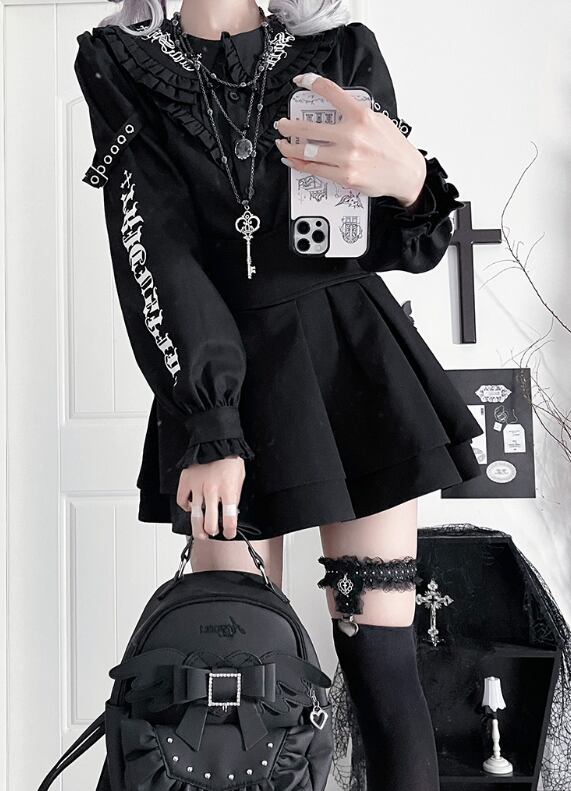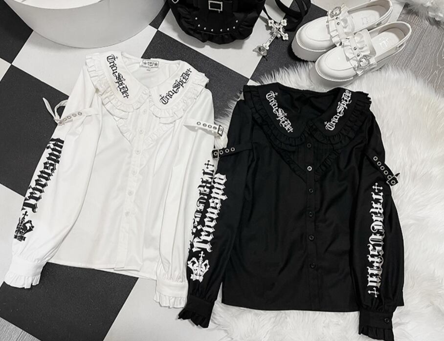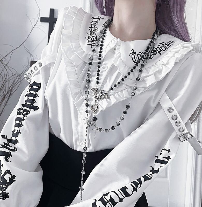 ゴシック調なデザイン文字とフリルの丸襟がダークフェミニンな雰囲気の長袖ブラウス。