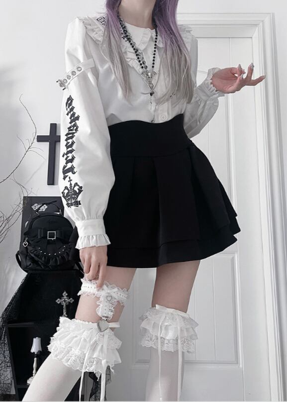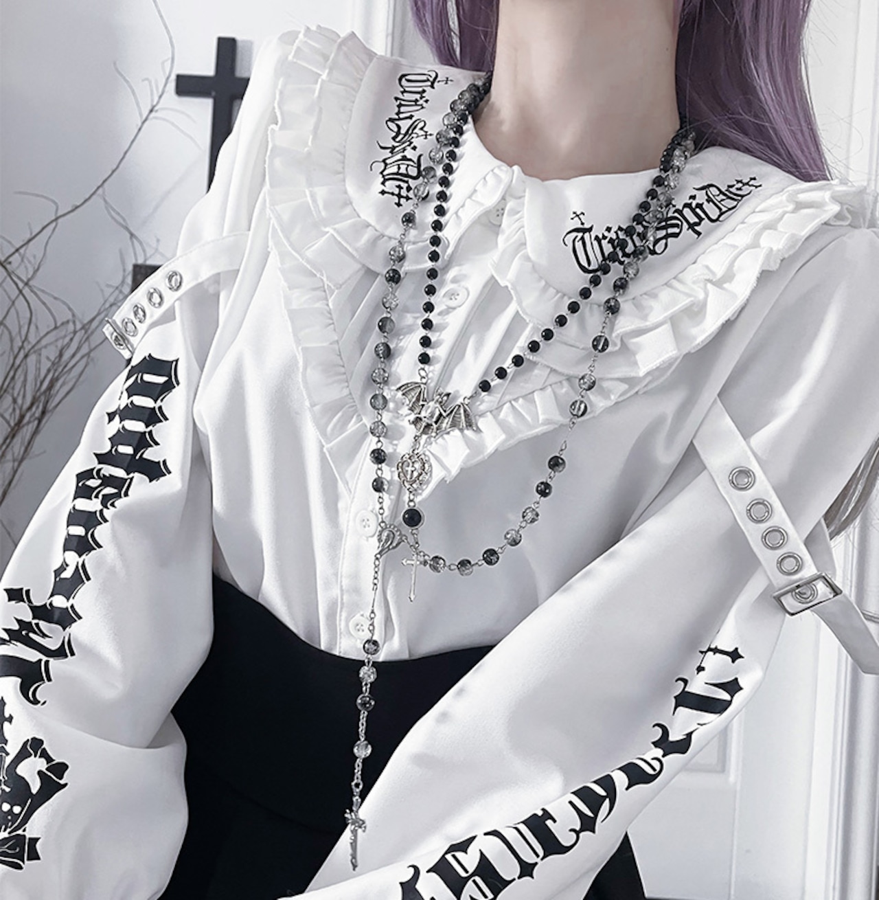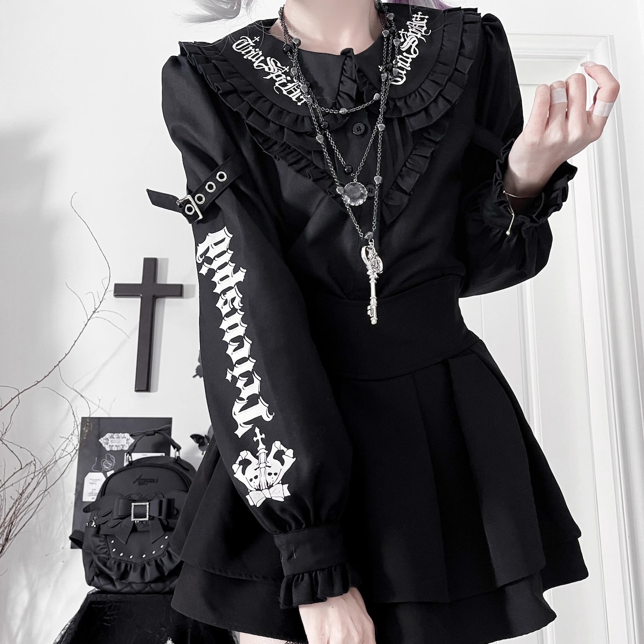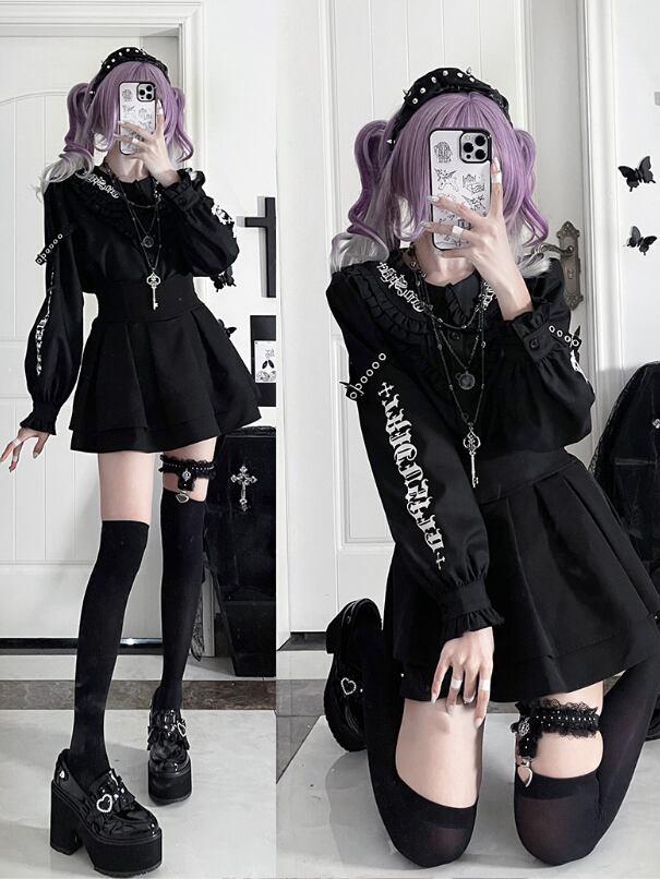 ゴシック調なデザイン文字とフリルの丸襟がダークフェミニンな雰囲気の長袖ブラウス。