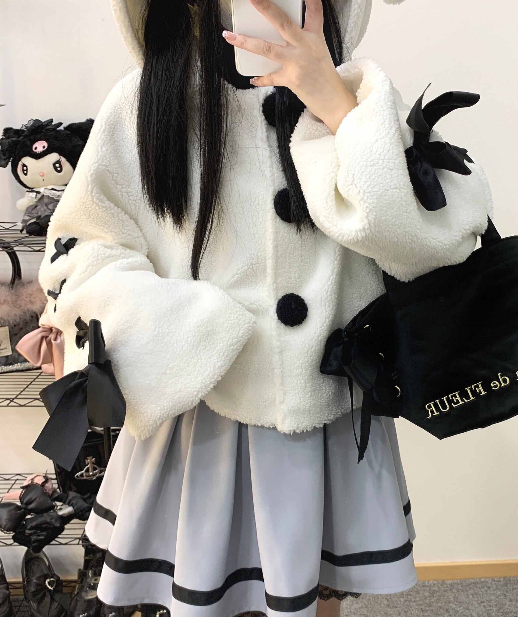 Myurina うさ耳リボンボアジャケット 地雷系 フェイクファー ロリータ 起毛 フードパーカー もこもこ ショートジャケット 参戦服 フリースブルゾン サブカル メンヘラ 病みかわいい 天使界隈 秋冬 量産型