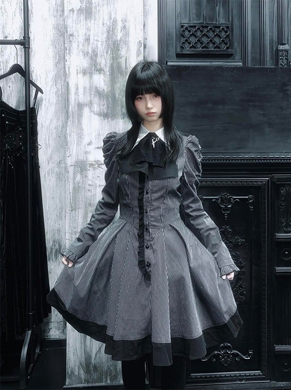 クラシカルなストライプ柄にたっぷりのフリルをあしらった、存在感抜群のゴシックワンピース。