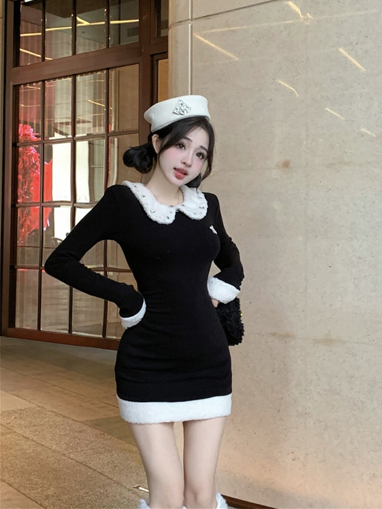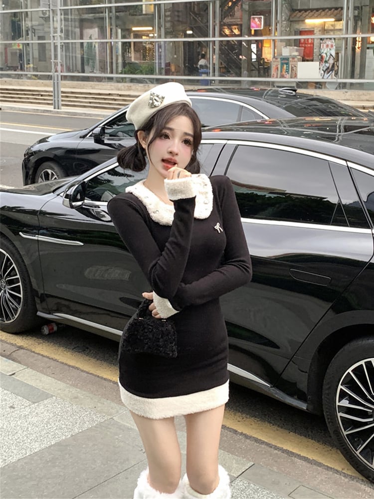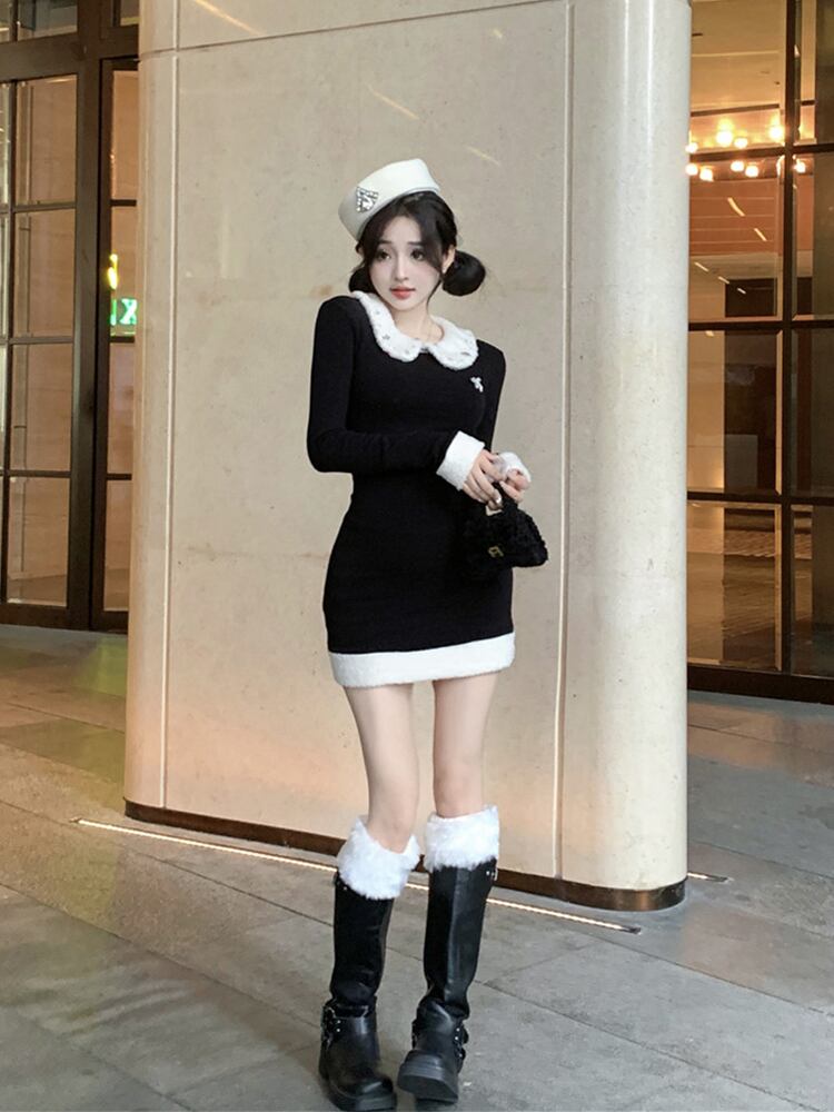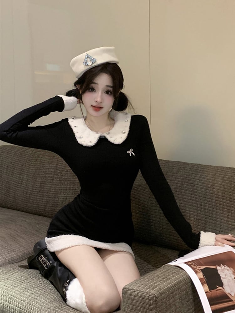 Myurina ビジューボアニットワンピース miu系 長袖ワンピース 全2色 ミニワンピース Aラインワンピース 切替ワンピース 襟付きワンピース 秋冬 レディース服 ヲタク 参戦服 量産型 パーティー