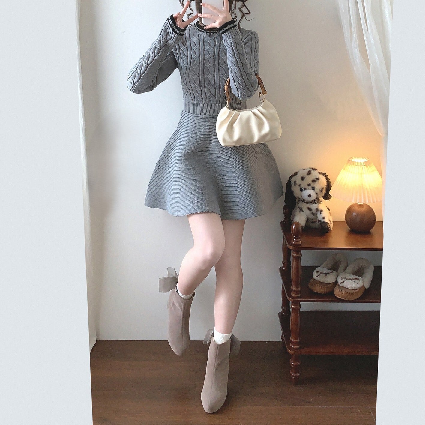 Myurina ケーブルニット切替フレアワンピース ワンホン ミニワンピース 長袖ワンピース 地雷系 量産型 ニットワンピ 上品 参戦服 Aラインワンピース デート服 秋冬 ヲタク 韓国 miu系穿搭