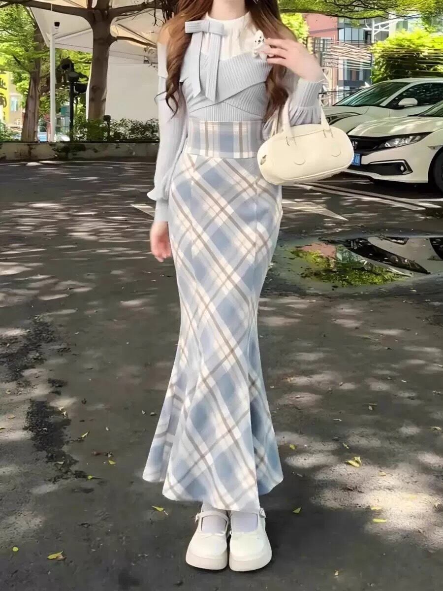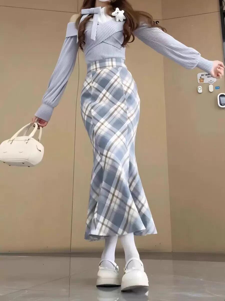 Myurina チェック柄マーメイドスカート 量産型 ロングスカート タイトスカート サックス 地雷系 上品 参戦服 秋冬 ヲタク 韓国 平成ギャル ワンホン