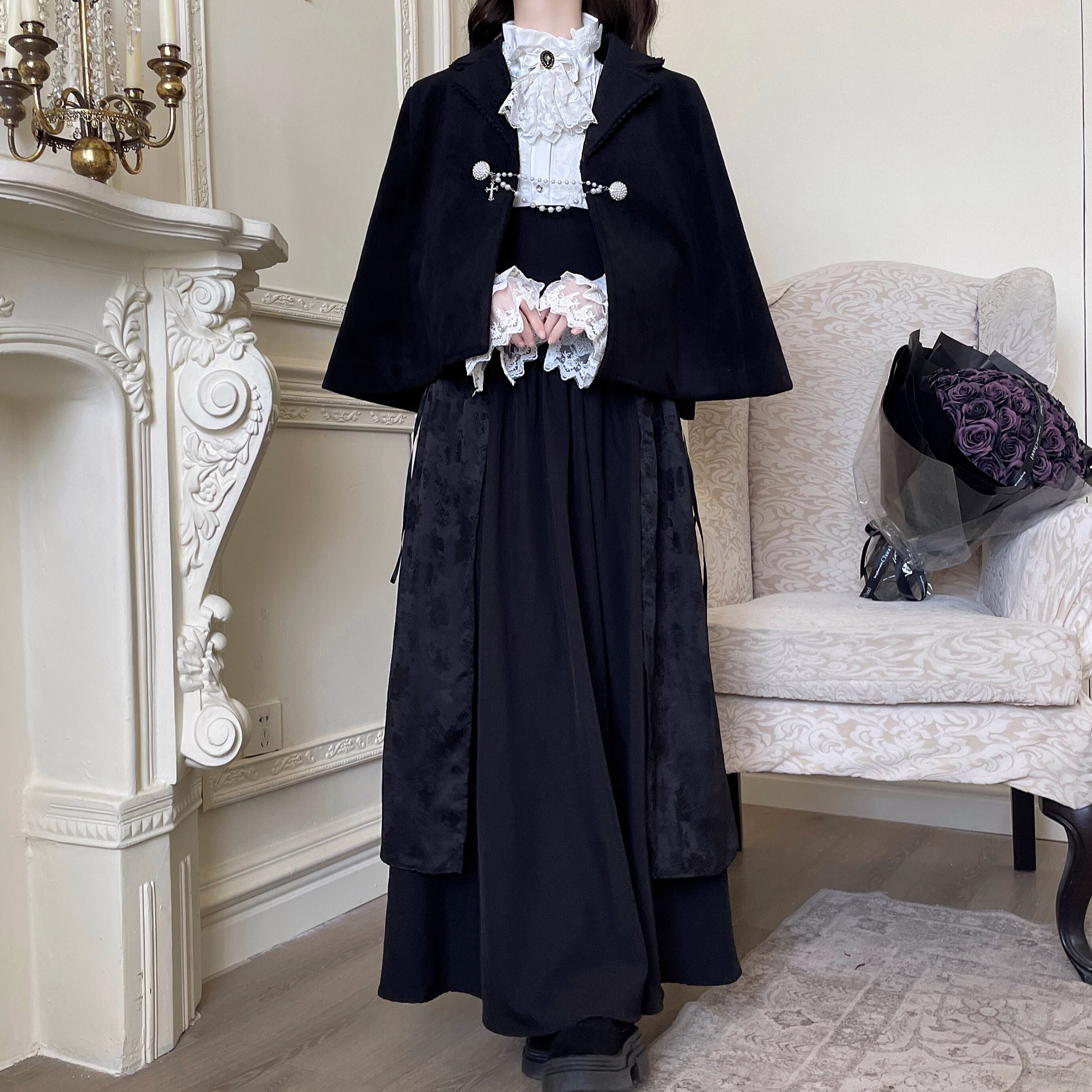 重厚感のある生地に、エンブロダリーレースとコルセット風デザインが魅力のゴシックロングスカート。