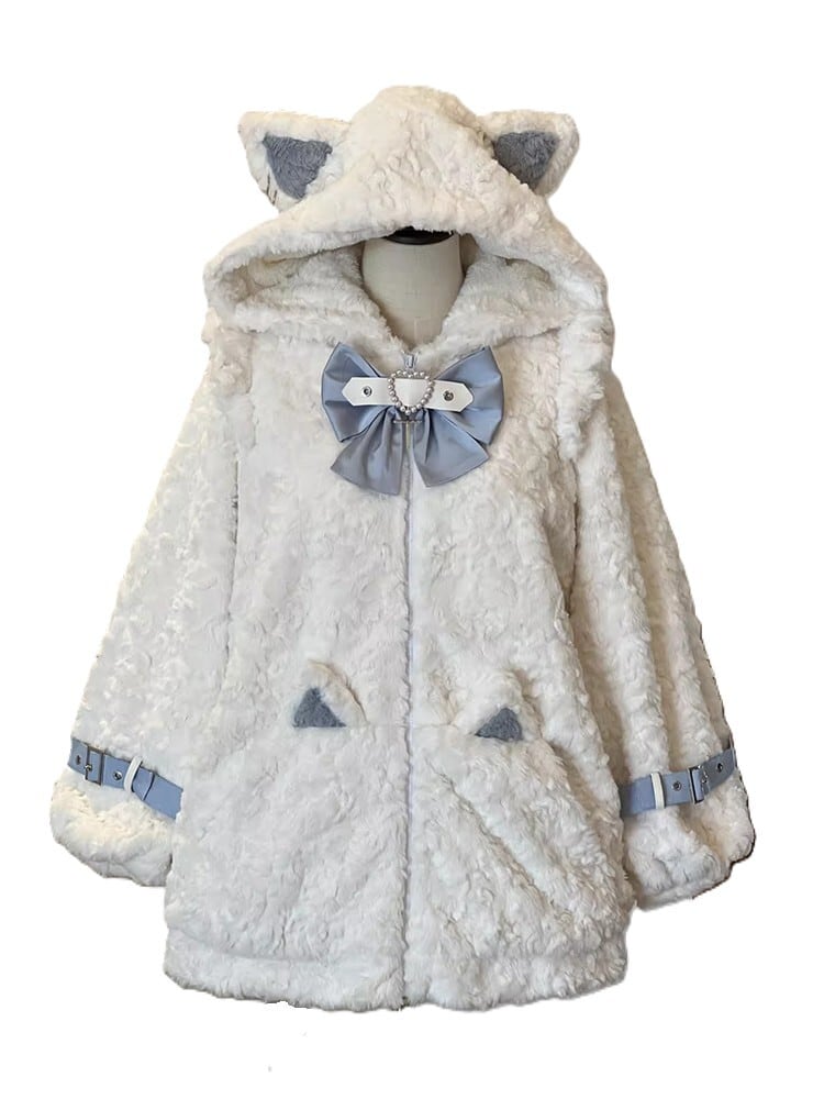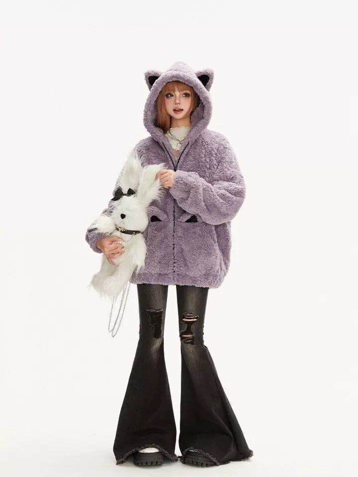 Myurina 猫耳もこもこファーブルゾン 地雷系アウター フリースパーカー 天使界隈 ジップアップパーカー サブカル 起毛 フードパーカー ボアジャケット 参戦服 メンヘラ 病みかわいい 秋冬 ルームウェア 量産型 ロリータ