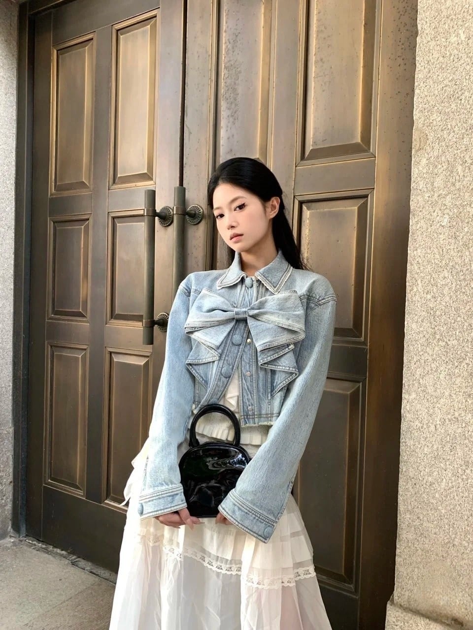 Myurina リボンデニムショートジャケット 量産型 miu系穿搭 デニムジャケット クロップド丈 Gジャン ブルゾン ストリート系 地雷系 秋冬レディースアウター 参戦服 韓国 ワンホン デート服