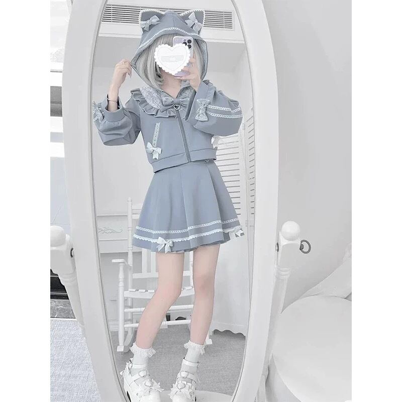 Myurina 猫耳レースリボンジャージセットアップ 地雷系 天使界隈 ブルゾン×ミニスカート 2点セット 水色界隈 パーカー セーラー風ワンピース 原宿 サブカル ミニスカート フレアスカート 大きめサイズ トラックジャケット ヲタク 参戦服 量産型 ハロウィン ルームウェア