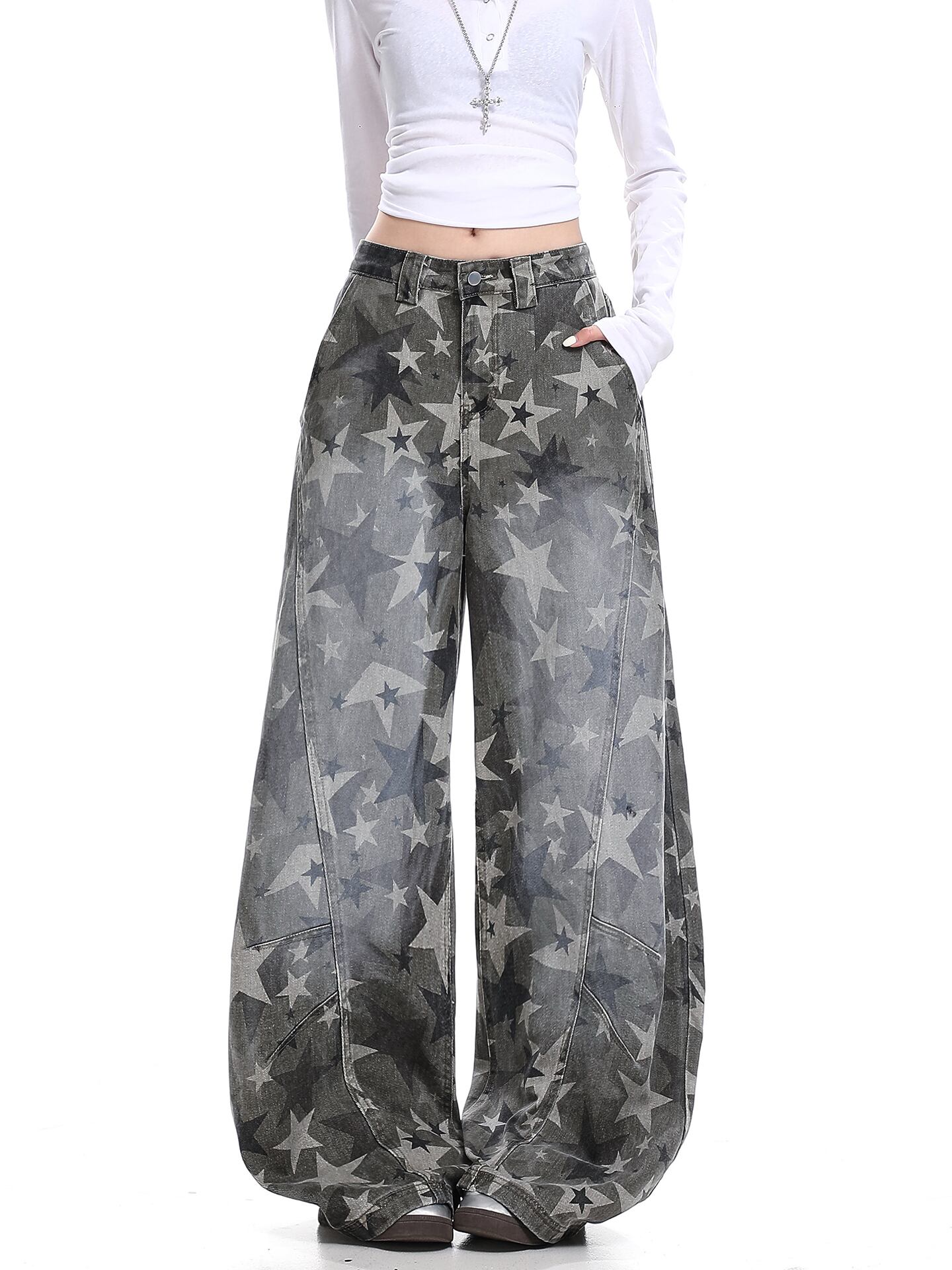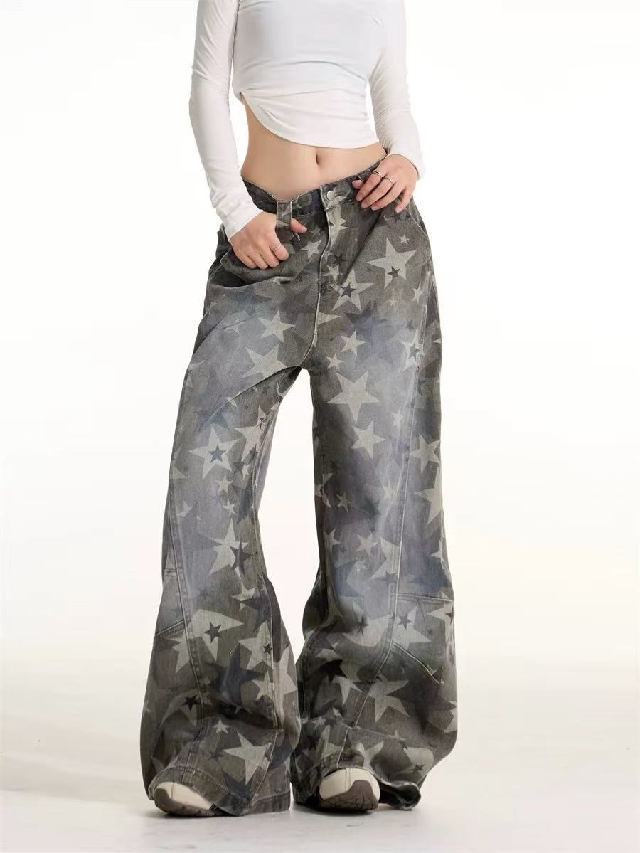 Myurina 星柄デニムバギーパンツ 平成ギャル フェアリーグランジ 体型カバー 大きめサイズ ワイドパンツ ジーンズ カーゴパンツ バルーンパンツ ワークパンツ Y2K 00s 韓国ストリート系 ヴィンテージ