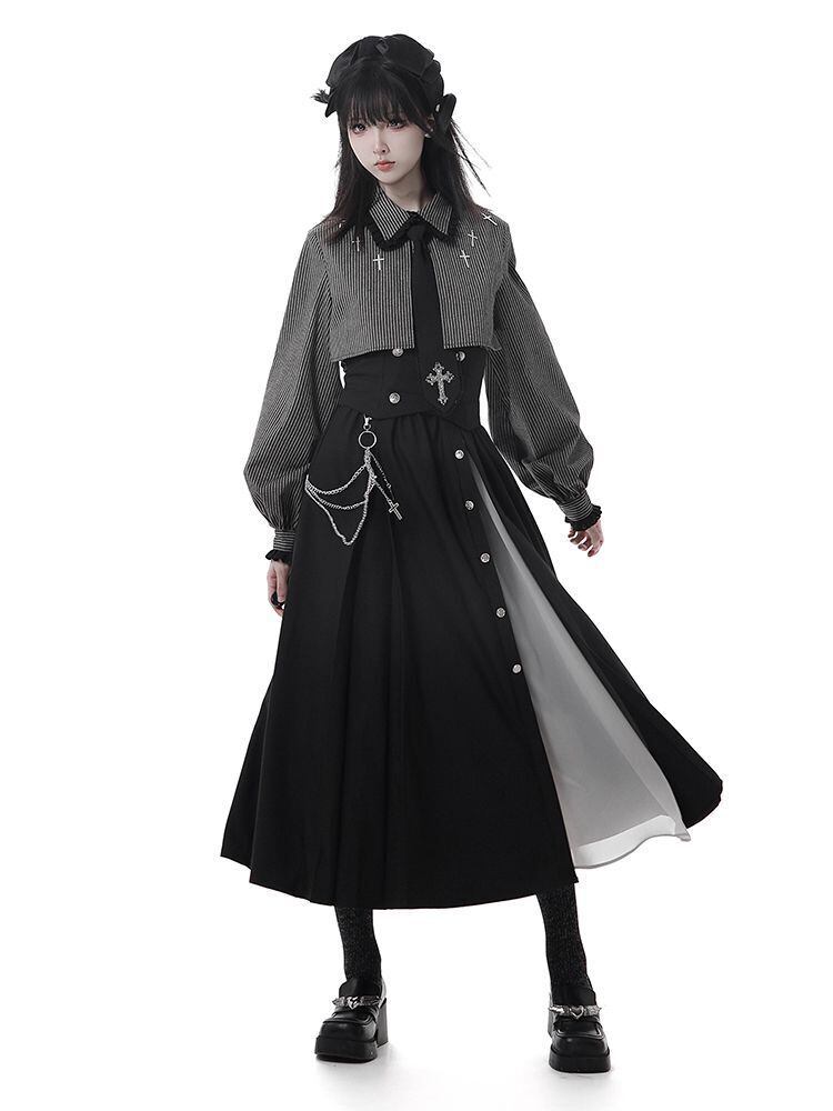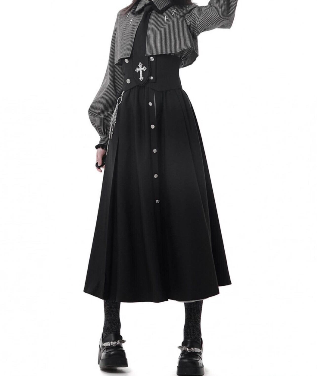 付属のチェーンとベルト装飾が、パンク・ストリートなムードを高めるロングスカート。シンプルなボックスプリーツで、どんなトップスとも合わせやすい着回し力抜群のデザインです。厚底ブーツやニーハイソックスと合わせて、Y2Kや地雷系、K-POPアイドル風の着こなしを楽しめます。