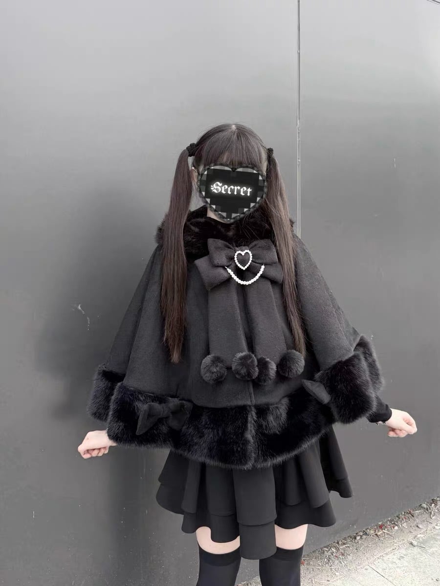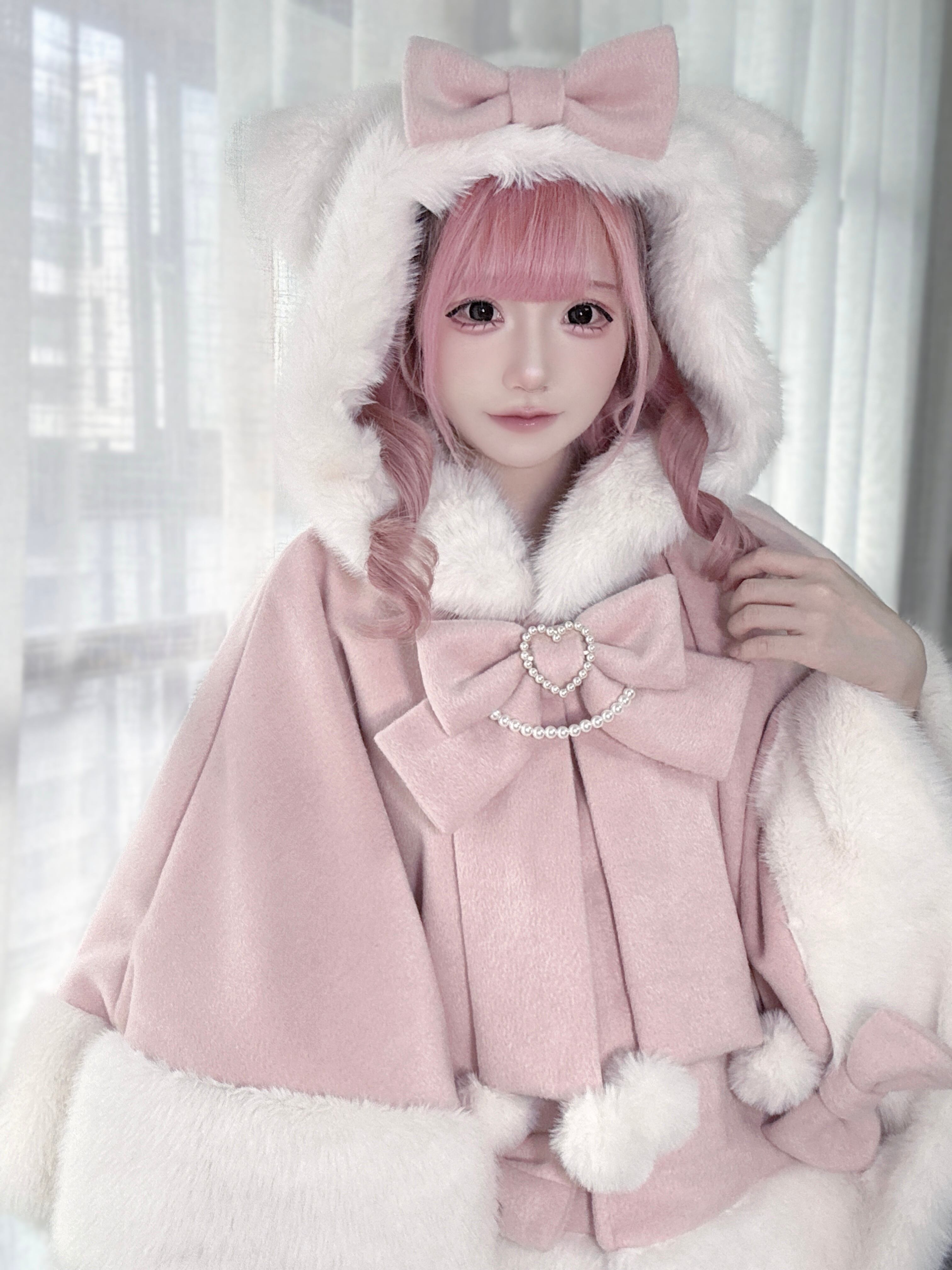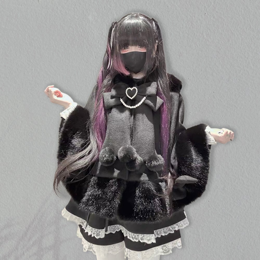 Myurina 地雷系 猫耳ボリュームファーポンチョコート ケープコート ファーコート 量産型 リボンコート ロリータ フード付き マント 参戦服 サブカルアウター パステルカラー 天使界隈 リボンコート メンヘラ 病みかわいい 秋冬 姫ロリ