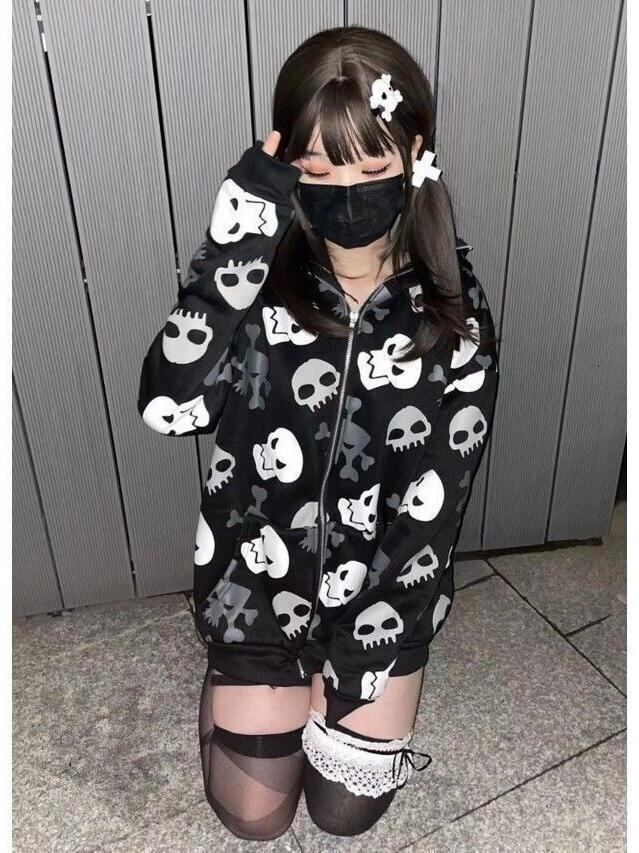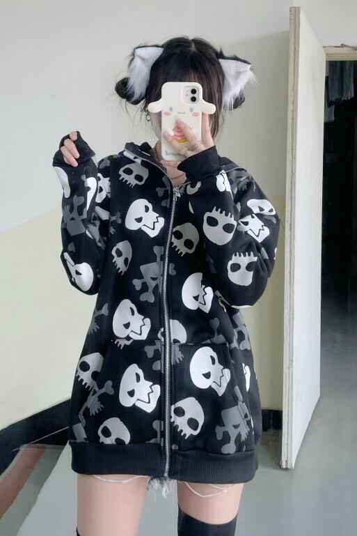 Myurina 地雷系 ドクロ柄ジップアップパーカー サブカルアウター ビッグシルエット フードパーカー 天使界隈 スウェット オーバーサイズ ゆったり ダークコケット ダークコア 原宿 韓国ストリート 参戦服 メンヘラ 病みかわいい 秋冬 ルームウェア