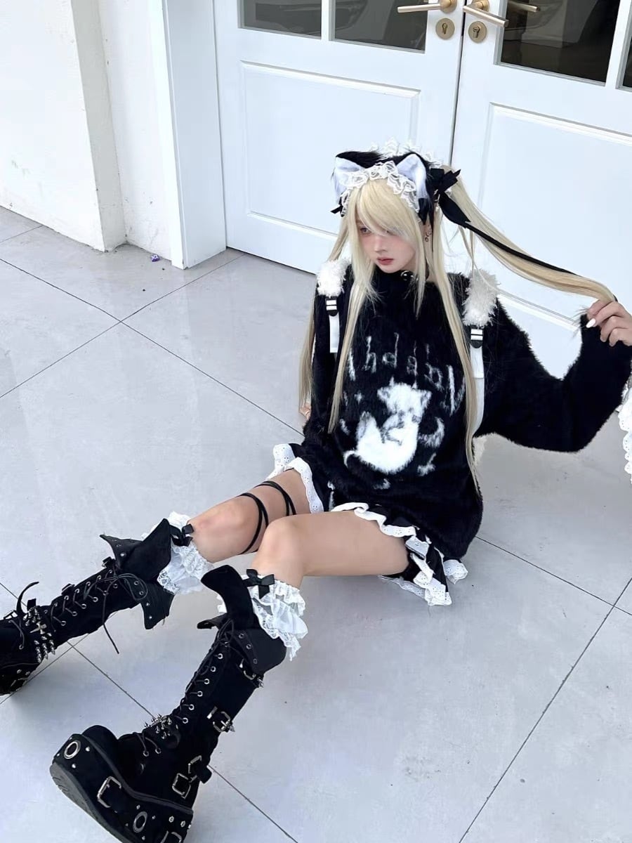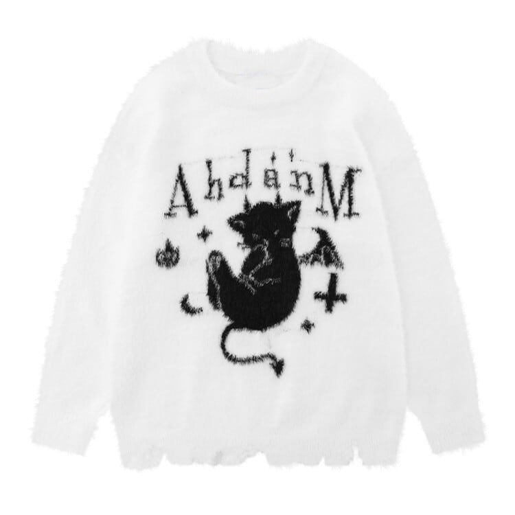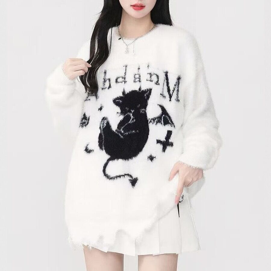 Myurina デビルキャットモヘアニットトップス サブカル 地雷系 プリント 長袖セーター ダメージニット シャギーニット 起毛 ふわふわ ロンT 猫イラスト ビッグシルエット メンヘラ 病みかわいい ダークコア ストリート系 天使界隈