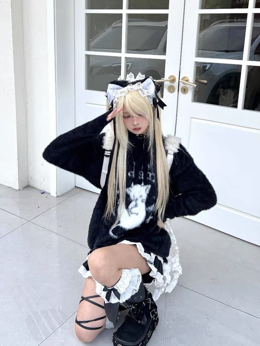 もこもこのモヘア調素材にサブカル風の猫モチーフをオン。ダメージデザインも加え、程よくダーク感とルーズさのあるシルエットで抜け感たっぷり。韓国ストリート系、地雷系やサブカルコーデと相性抜群です♡