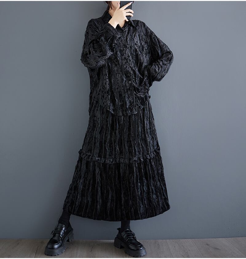 Myurina ベロアクラッシュシャツブラウス モード系 ポロシャツ ジャガードシャツ ゆったり ユニセックス 大人カジュアル ベルベットシャツ サブカル モノクロ ダークコケット ダークコア ゴスロリ