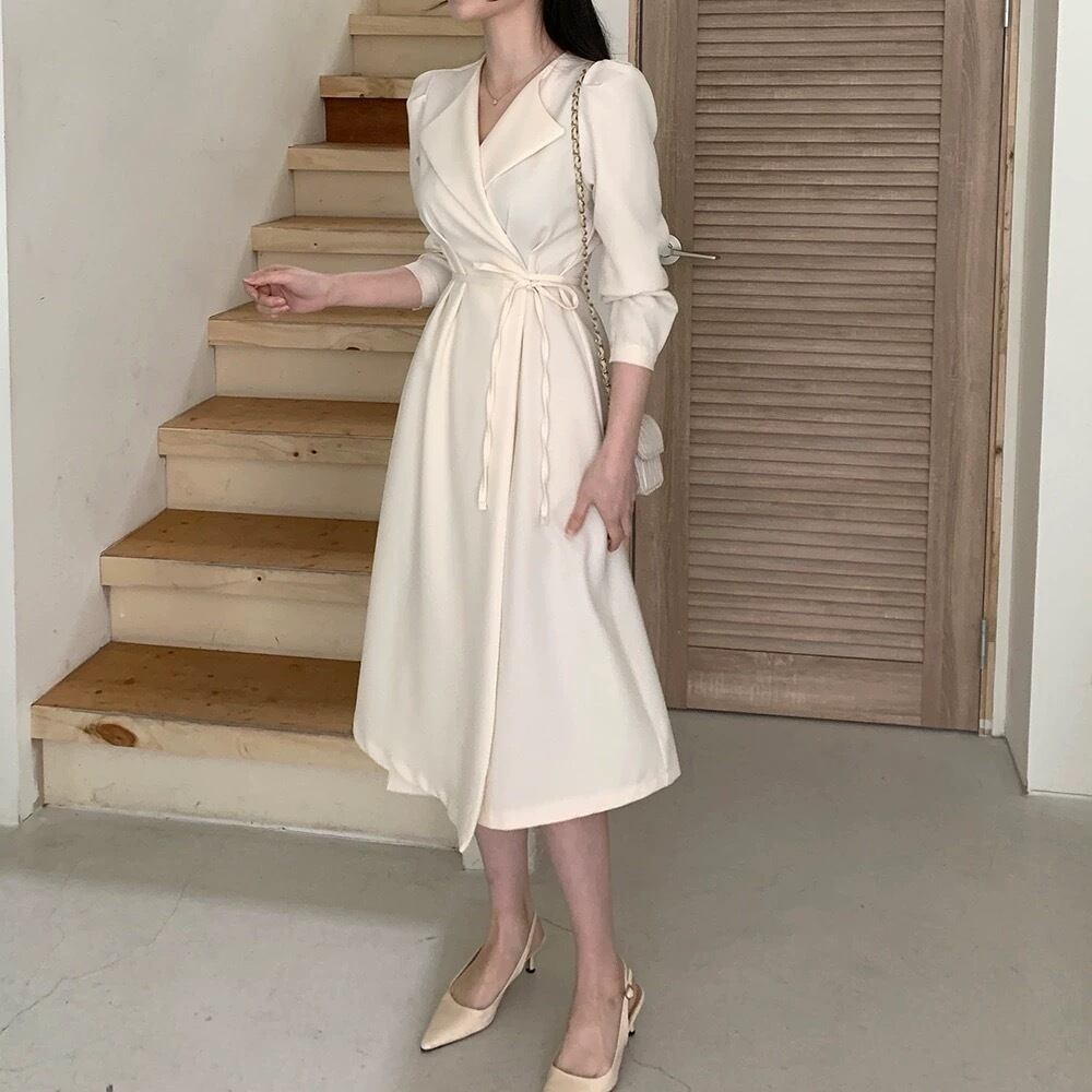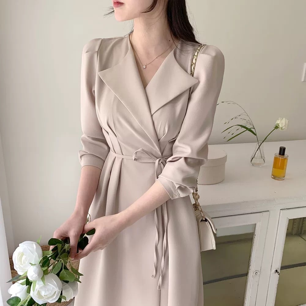 Myurina ウエストリボンシャツワンピース 上品 ワンホン 切り替えワンピース 大人カジュアル カシュクール 体型カバー ロングワンピース フレア Aライン Vネック シフォンワンピース miu系穿搭 港区女子 デート服