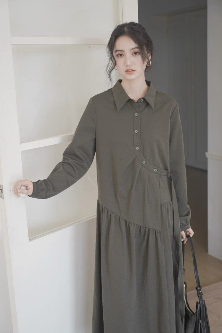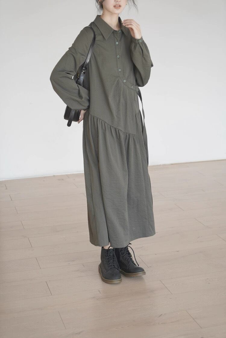 Myurina アシメボタン襟付きシフォンワンピース 大人カジュアル 体型カバー ロングワンピース 上品 フレア 切り替えワンピース Aライン シフォンワンピース miu系穿搭 レディース服
