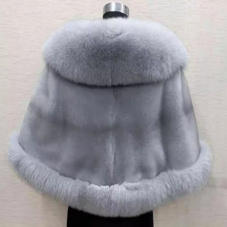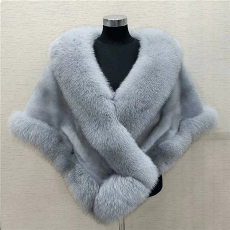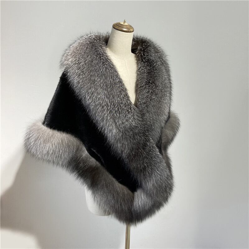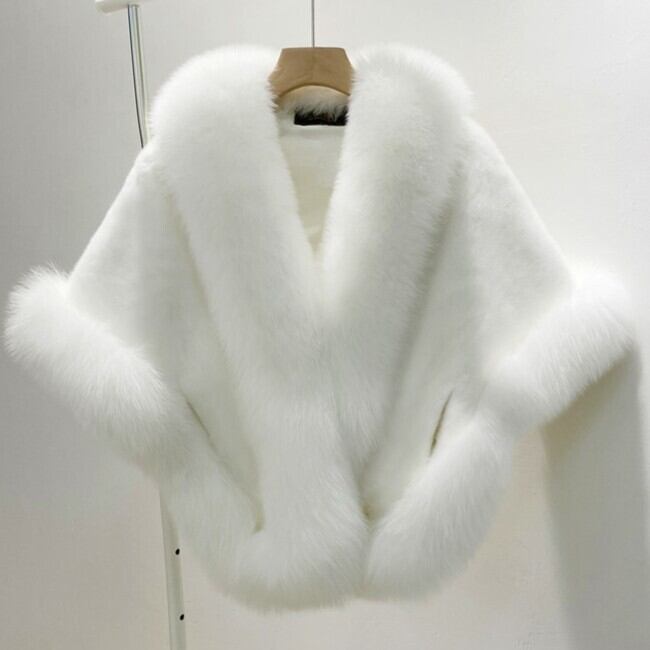 たっぷりとしたボリュームファーが顔まわりを華やかに魅せるショールケープ。