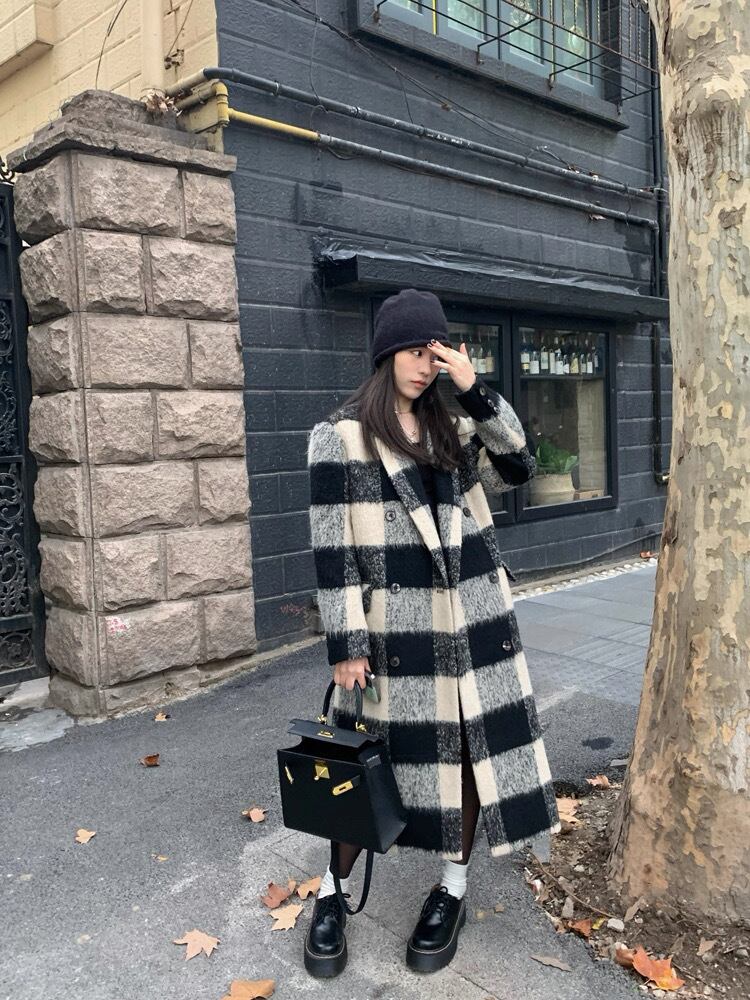 存在感のある大きめチェックが魅力のモヘア風ロングコート。