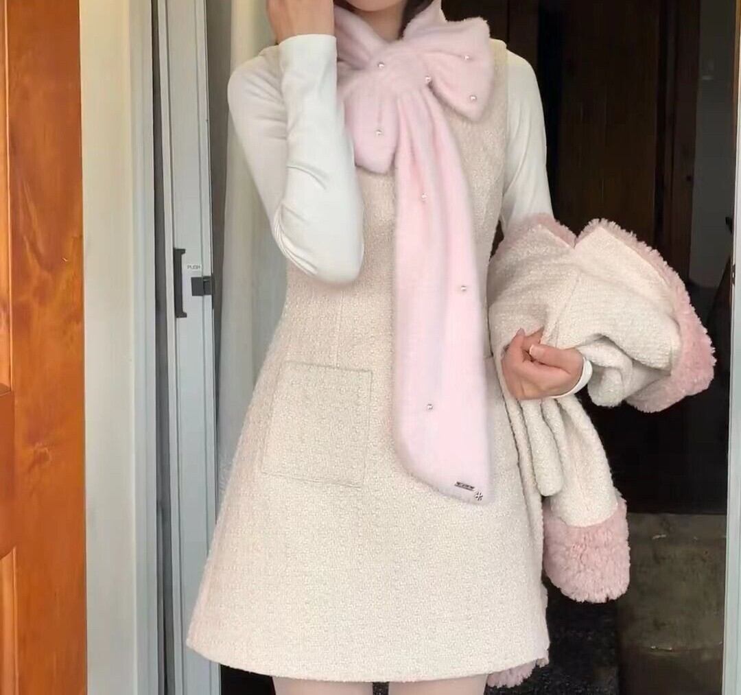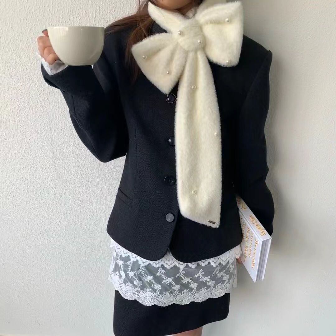 首元を華やかに暖かく包み込むリボン型マフラー。