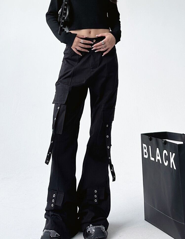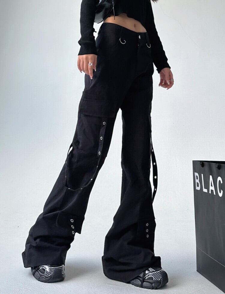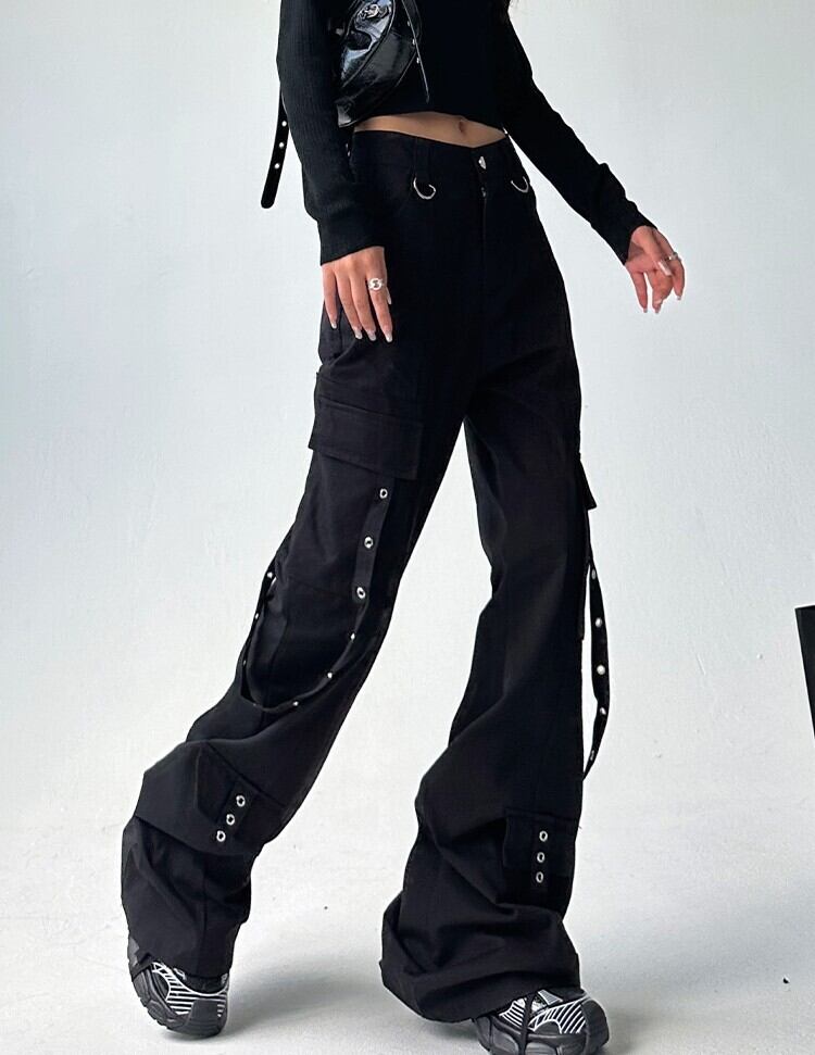 Myurina ハトメベルトカーゴパンツ モード ダークコケット ワークパンツ ワイドパンツ サブカル ユニセックス 地雷系 Y2K 黒 Dカン ハトメリングベルト ハイウエスト ワークパンツ Y2K 00s 韓国ストリート系 平成ギャル フェアリーグランジ
